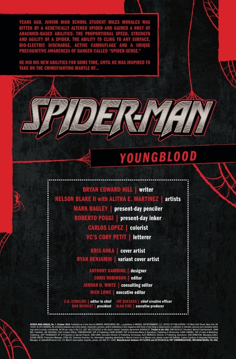 STARRING MILES MORALES! Before he wore the webs, he was just Miles Morales: newly-minted Brooklyn Visions Academy student with hidden spider powers! When a Secret Invasion of Skrulls turns Manhattan upside down, Miles must choose: do his great powers come with great responsibility? A mysterious new chapter for Miles is unveiled by rising superstars Bryan Edward Hill (Detective Comics) and Nelson Blake II (Marvel New Year’s Eve Special)
