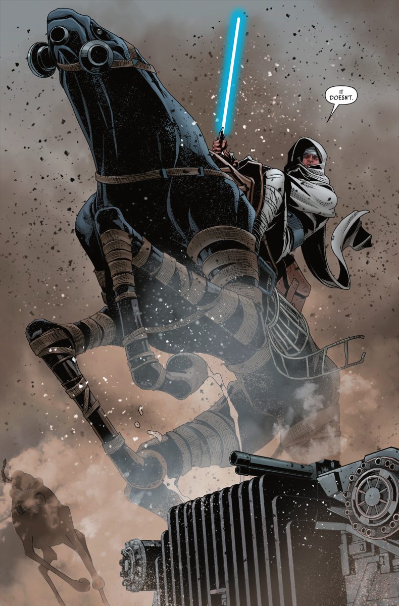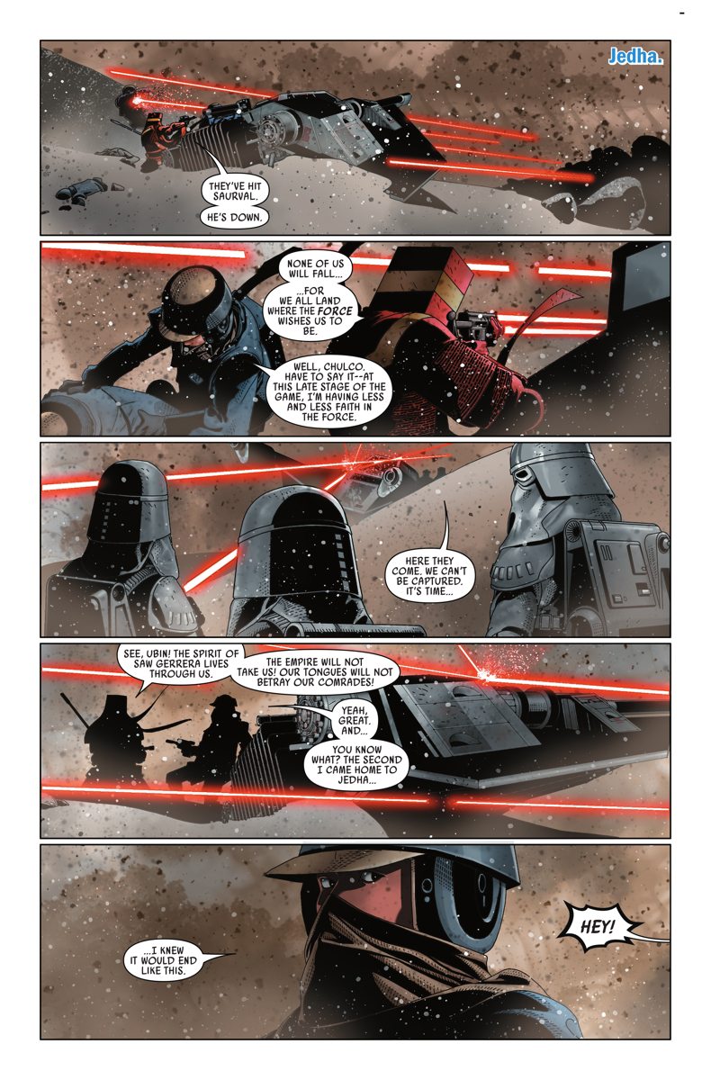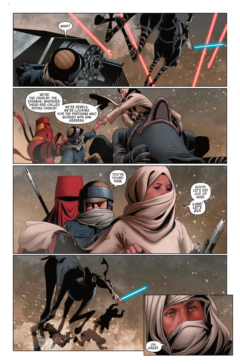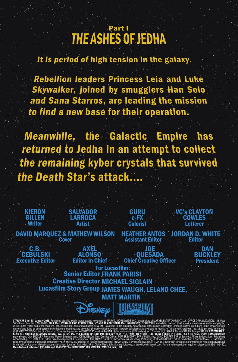 The Rebel Alliance turns its attention to the shattered planet of Jedha! Once the site of great significance to the Jedi, Jedha was left in ruins when the Death Star annihilated the Holy City there. Now, new series writer Kieron Gillen joins artist Salvador Larroca to bring Luke, Leia, Han, and the rest to the remains of the tragic victim of the Empire’s fury!