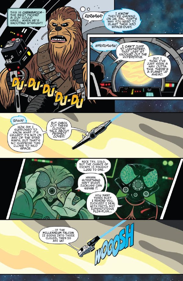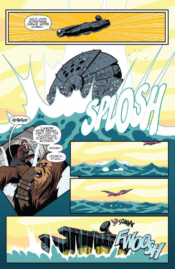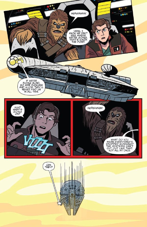 “Powered Down,” Part 1 (of 2). Han and Chewie are on the run from bounty hunters and take refuge on a planet that mysteriously shuts down all electronics. With no way off the planet, will our favorite scruffy duo be able to evade their pursuers?