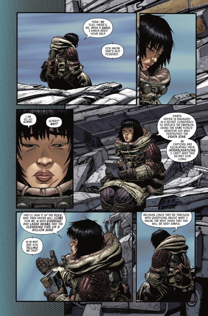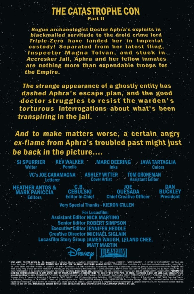 “BROKEN INSIDE” CONTINUES! Doctor Aphra may be in Imperial prison, but she’s certainly not alone. Rumors have it that these bars are haunted, but this rogue archaeologist knows there’s something much more valuable going on. Meanwhile, Aphra’s got information – information that the Rebellion wants. But how far are they willing to go–and who are they willing to recruit – in order to get it?