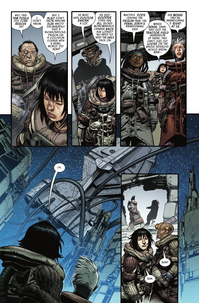 GOOD NEWS: THE IMPERIALS HAVE ABANDONED ACCRESKER JAIL. BAD NEWS: FIRST THEY SHOT IT AT A REBEL PLANET. For unscrupulous inmate DOCTOR APHRA, accompanied by former flame SANA STARROS and current flame INSPECTOR TOLVAN…(NB: Awkward.)…chances to escape are dwindling fast. Good thing Aphra’s not distracted by an expensive relic, right? Oh, dear.
