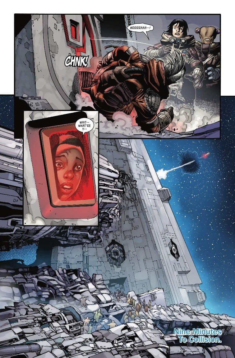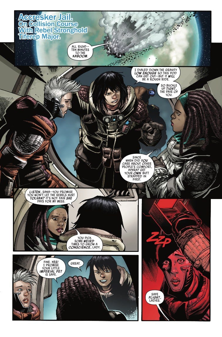 OUT OF THE FRYING PAN, INTO THE HEAT-DEATH OF A PLANET-KILLING METEOR STRIKE! Swindling, backstabbing and even occasionally feeling bad about it, all of DOCTOR APHRA’s attempts to escape her prison-world have failed. But…wait — here comes an Imperial shuttle. Could this be salvation? Wait…those breathing sounds seem familiar…