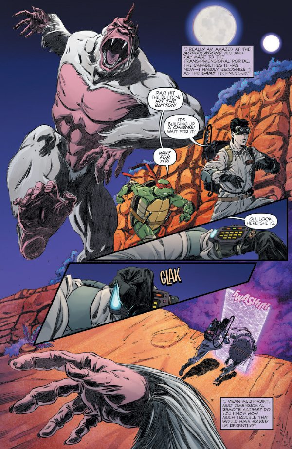 As the teams split up to evade their spectral pursuers, Michelangelo and Peter Venkman enter a dimension populated by anthropomorphic animals… including Turtle Ghostbusters!