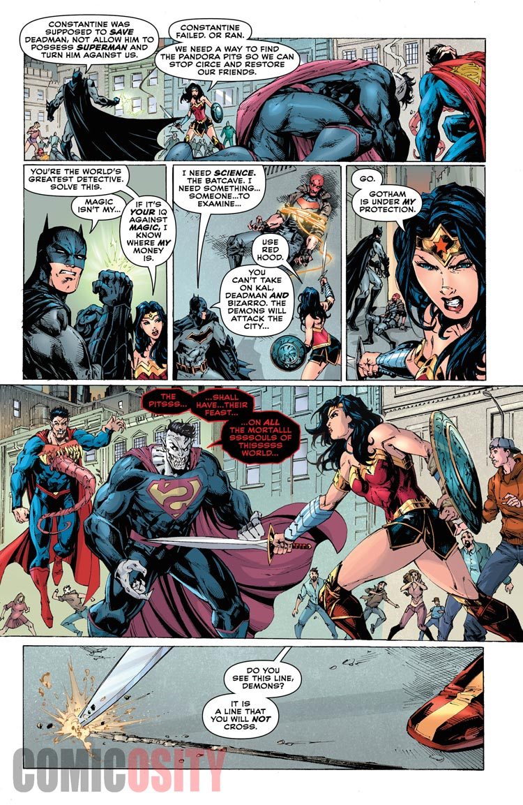 “DARK DESTINY” part three! The Pandora Pits’ secrets start to be revealed as Superman, Batman and Wonder Woman team with Constantine, Deadman, Zatanna, Red Hood, Artemis and Bizarro to attempt to close off the pits forever, but the dark energies are starting to corrupt the heroes.
