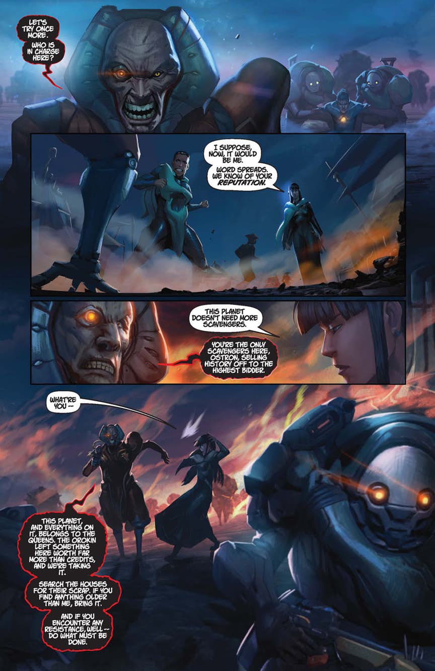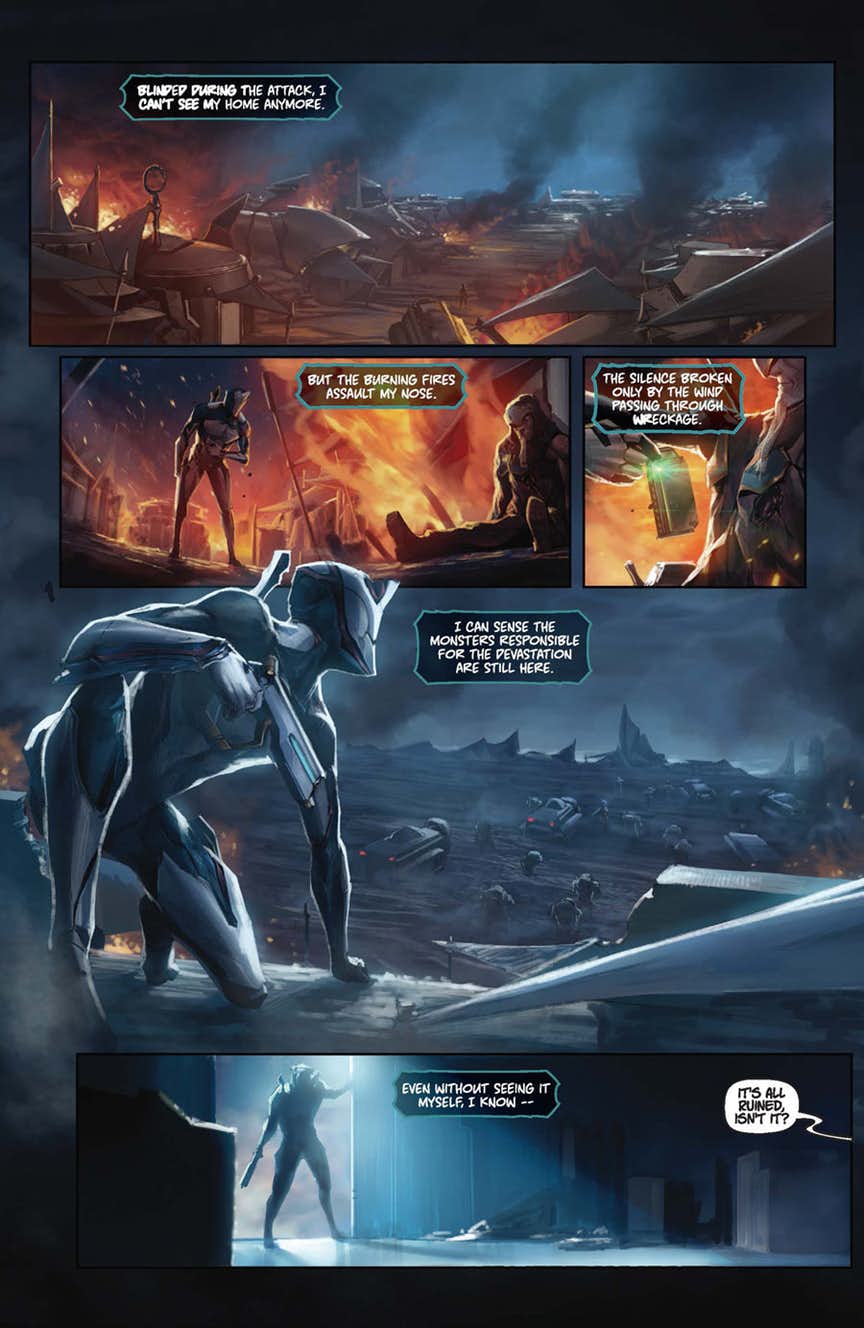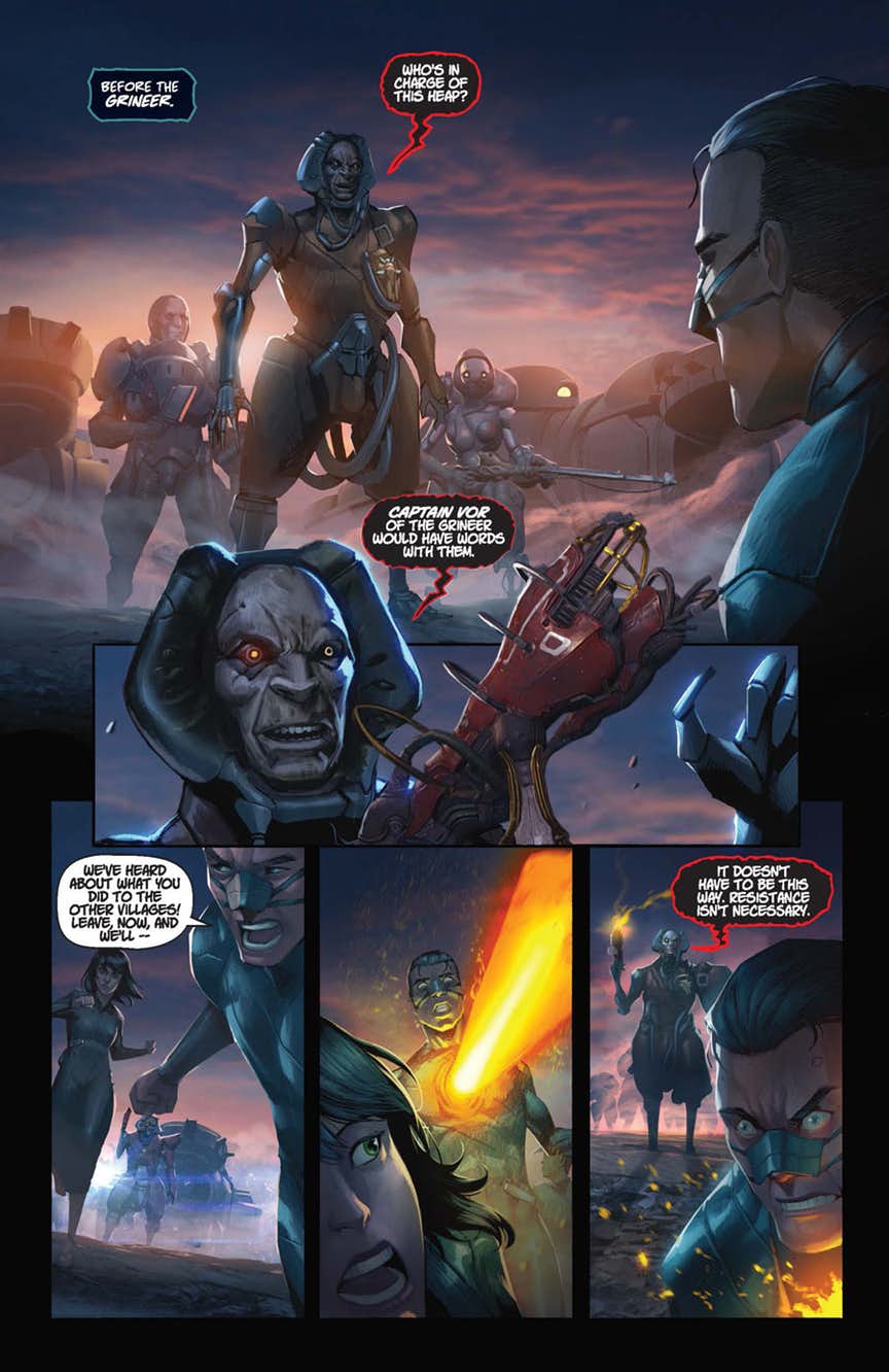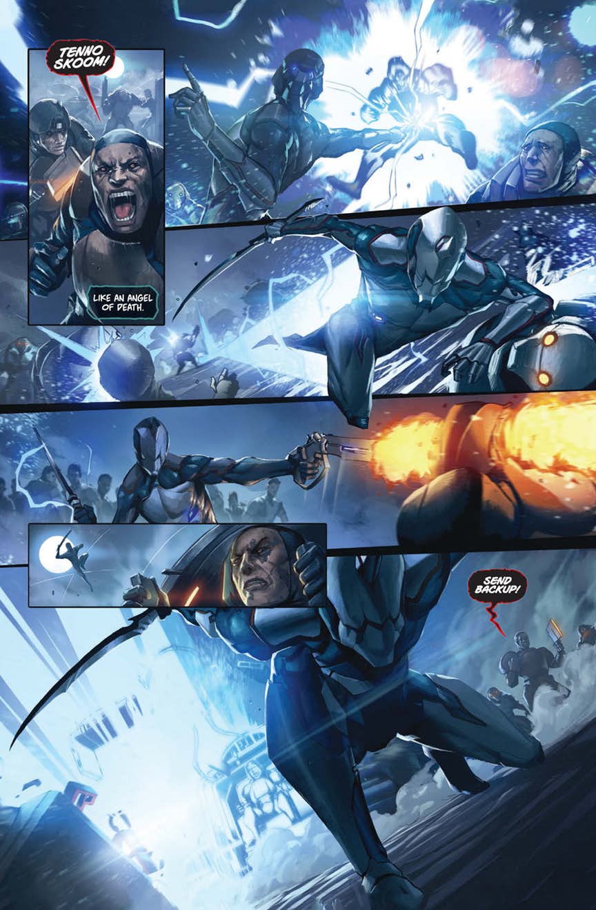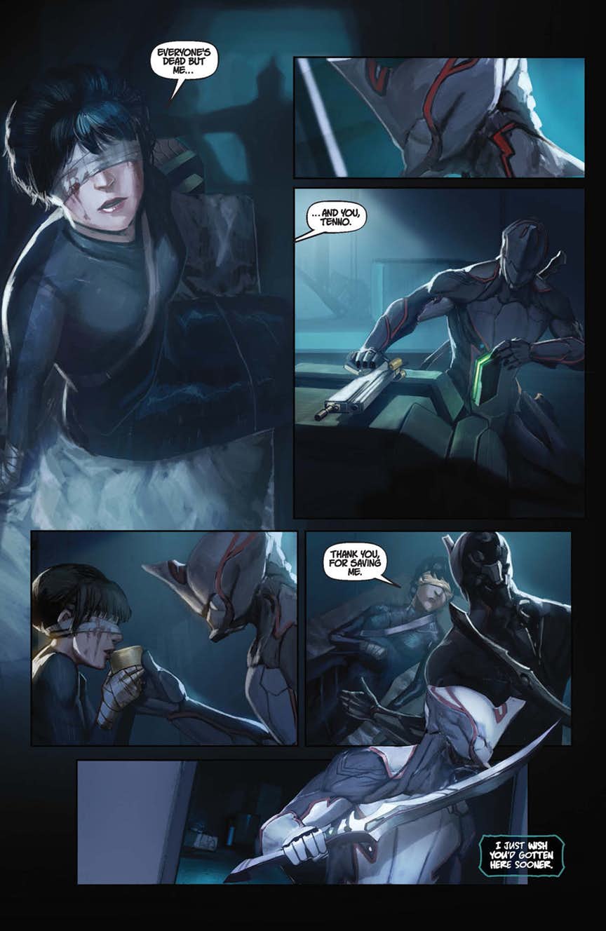The critically acclaimed free-to-play cooperative shooter comes to comics! In the far future, humanity’s descendants scramble to survive in a galaxy rife with conflict, scavenging for ancient technology and long-forgotten secrets. Only the Tenno, powerful warriors, battle to preserve peace and keep the technological masterpieces of the long-dead Orokin out of the wrong hands. Now, a faction of enhanced Grineer soldiers, under the tactician Captain Vor, scour the Earth for a hidden artifact, and only a lone Tenno and a blinded girl can stop them…