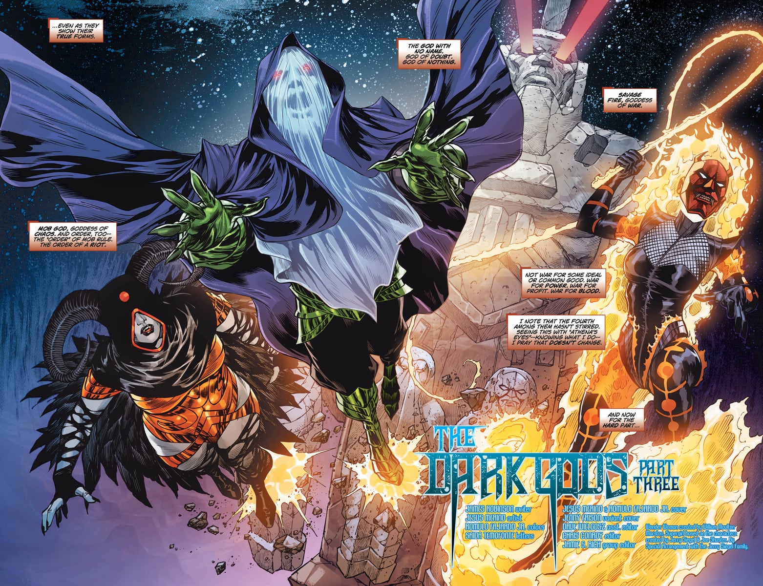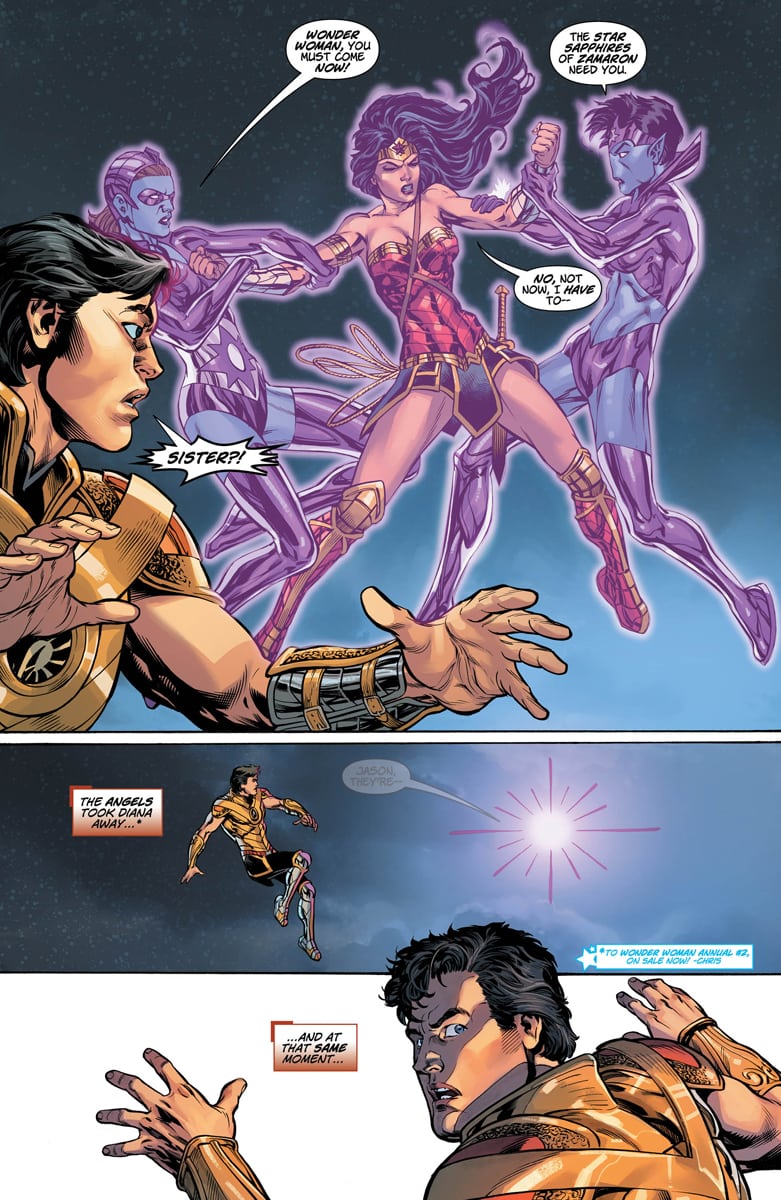 “The Dark Gods” part three! Every hero on Earth has tested their mettle against the Dark Gods—except for Wonder Woman, who’s not on Earth! With Diana lost in space fighting off the Gods’ assault on the Star Sapphires, it’s down to Jason to protect her planet and her friends…but, uh, he hasn’t won a fight yet…