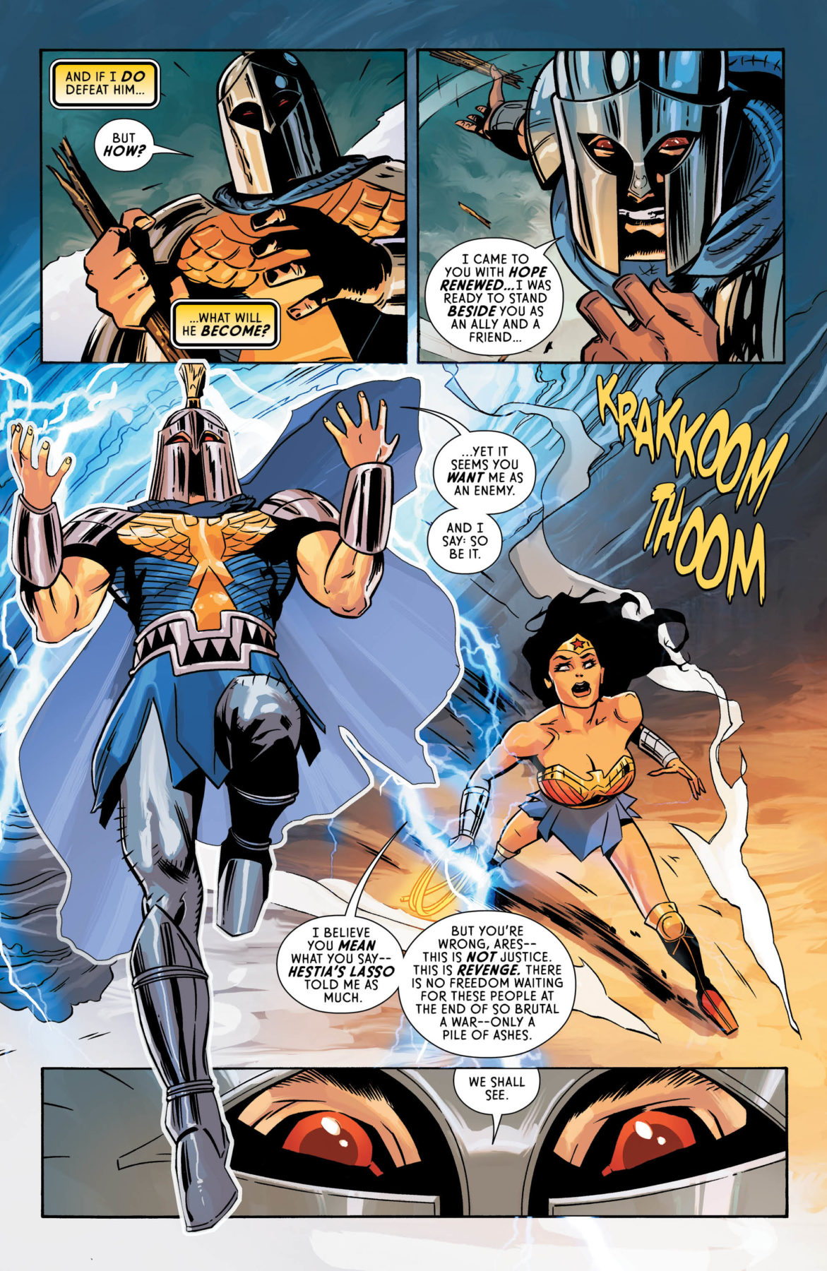 It’s a standoff of mythological proportions when Wonder Woman combats the resurrected God of War, Ares! While trying to stop a war, Wonder Woman appeals to Ares to intervene with her, but he thinks the two parties should fight it out and resolve it themselves. Guess dying and coming back didn’t do much to soften Ares’ M.O. Meanwhile, Steve Trevor’s been kidnapped and confronts his captor: the Goddess of Love, Aphrodite, who’s extremely pissed. Let’s see Steve schmooze his way out of this one!