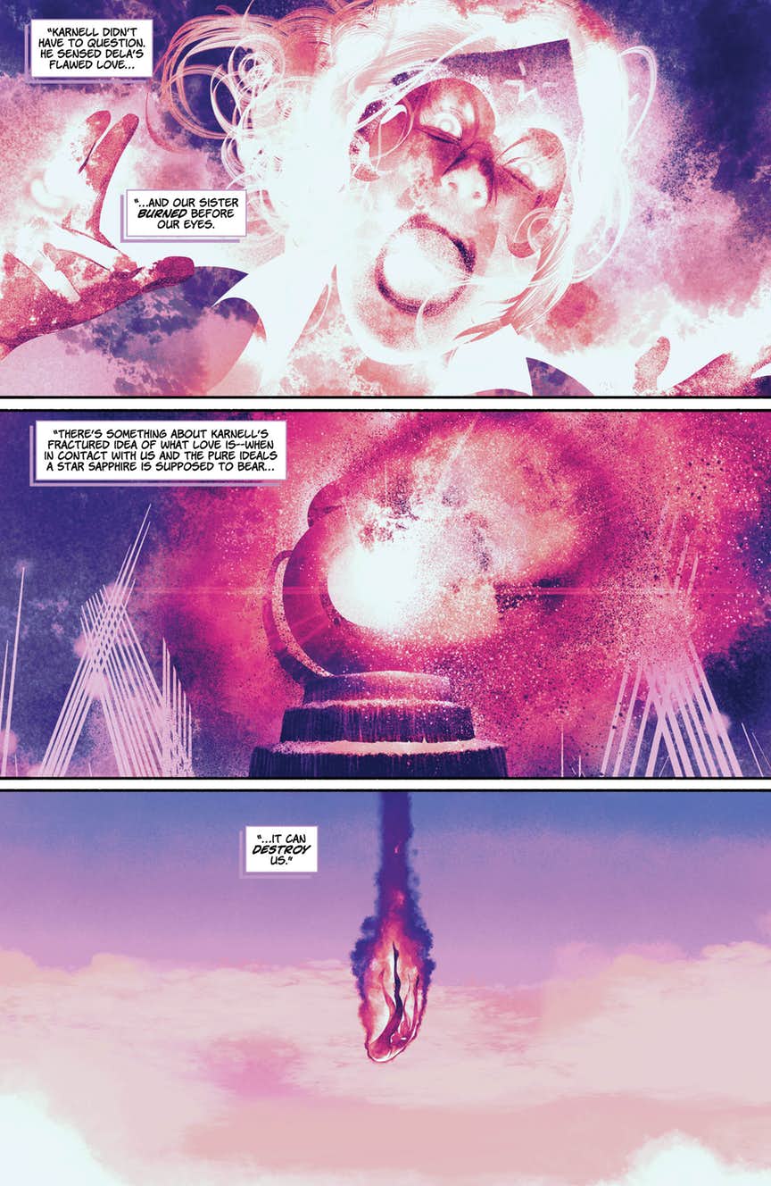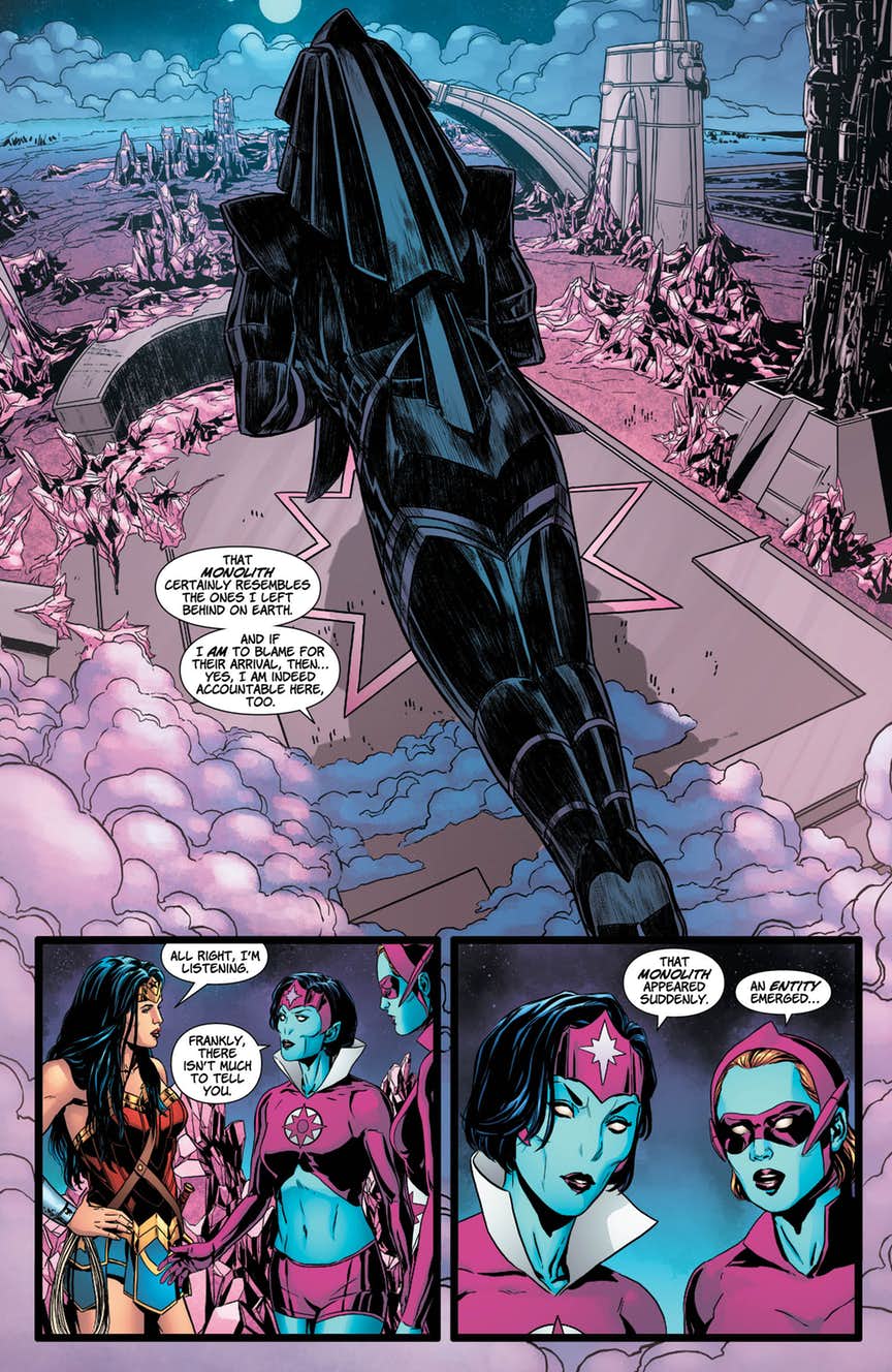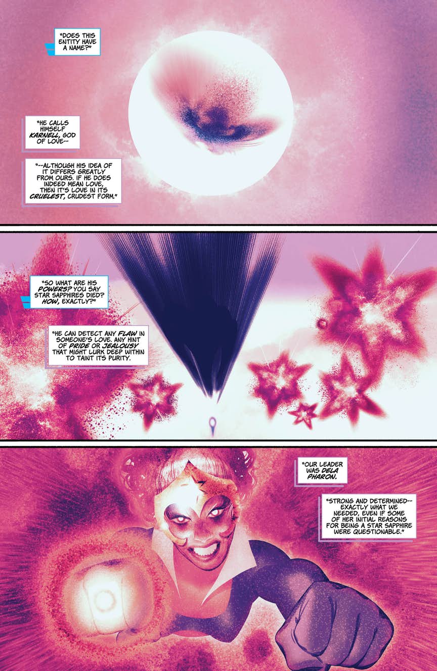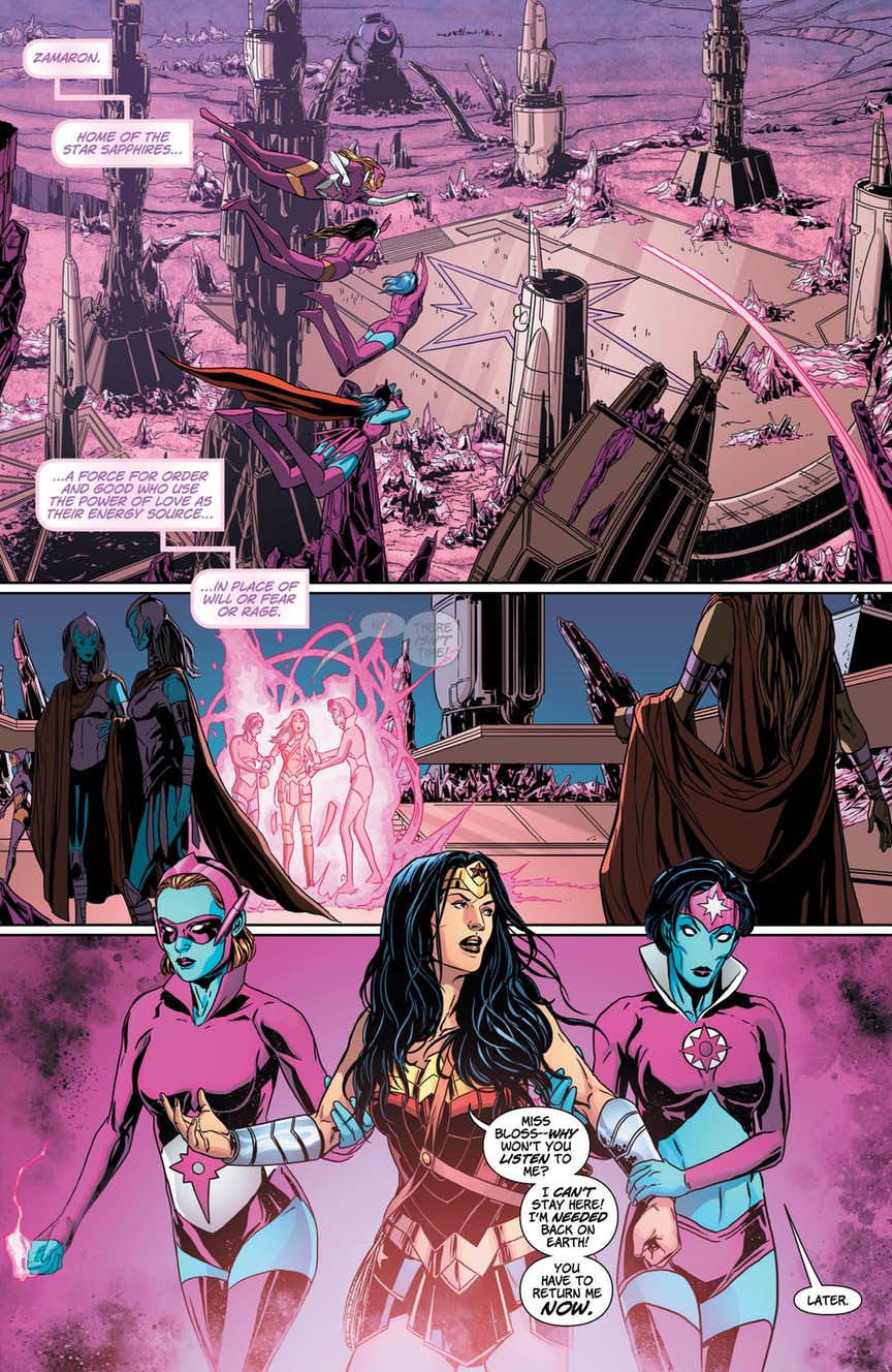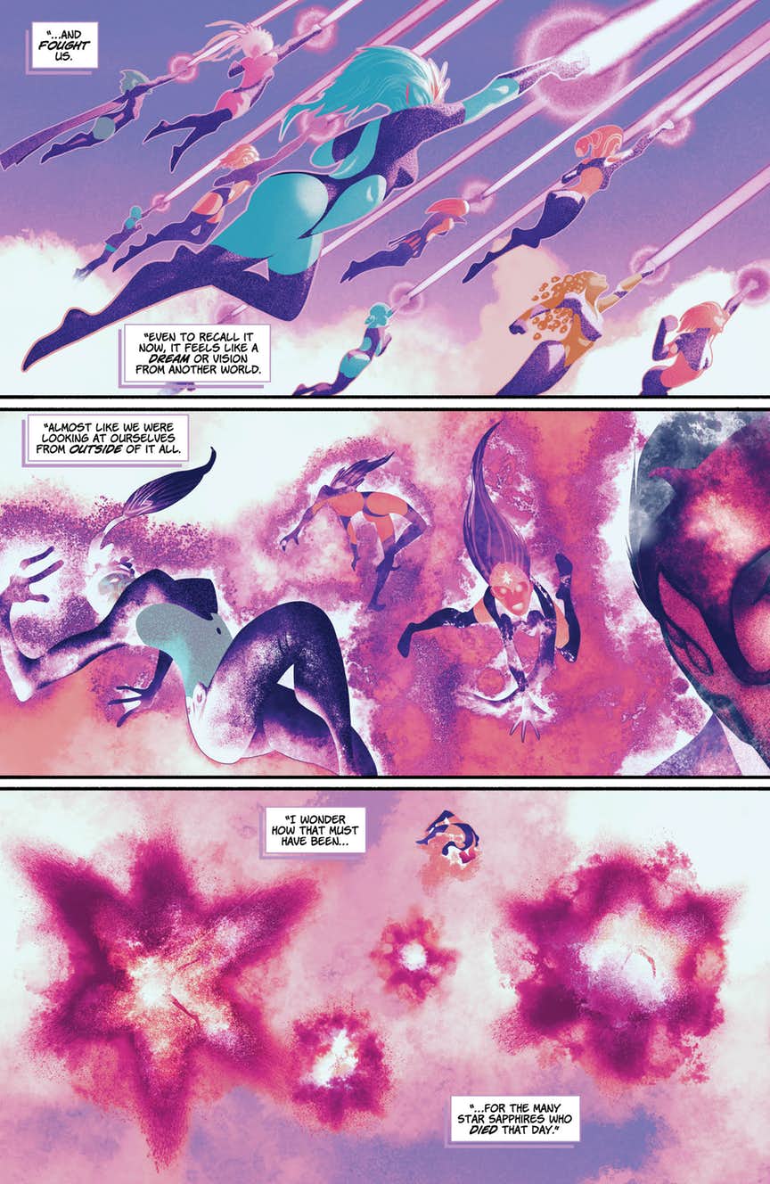 “Star Light”! An enormous, divine threat has the Star Sapphires in its sights—and only Wonder Woman can protect them! She’s wielded their ring before, but the Corps has changed since then…is even their combined power enough to stop a god?