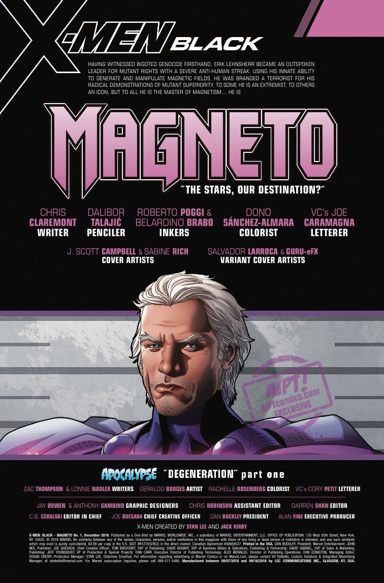 MAGNETO IS BACK…and so is Chris Claremont! For years, Magneto has done everything he can to achieve his goals for mutant domination. But now Magneto has declared that enough is enough. So what revolutionary plan does Magneto have that will change the face of mutantkind? And will anyone be able to stop him? Will anyone want to? PLUS: Includes Part 1 of X-MEN BLACK: APOCALYPSE the back up story by Zac Thompson, Lonnie Nadler, and Geraldo Borge!