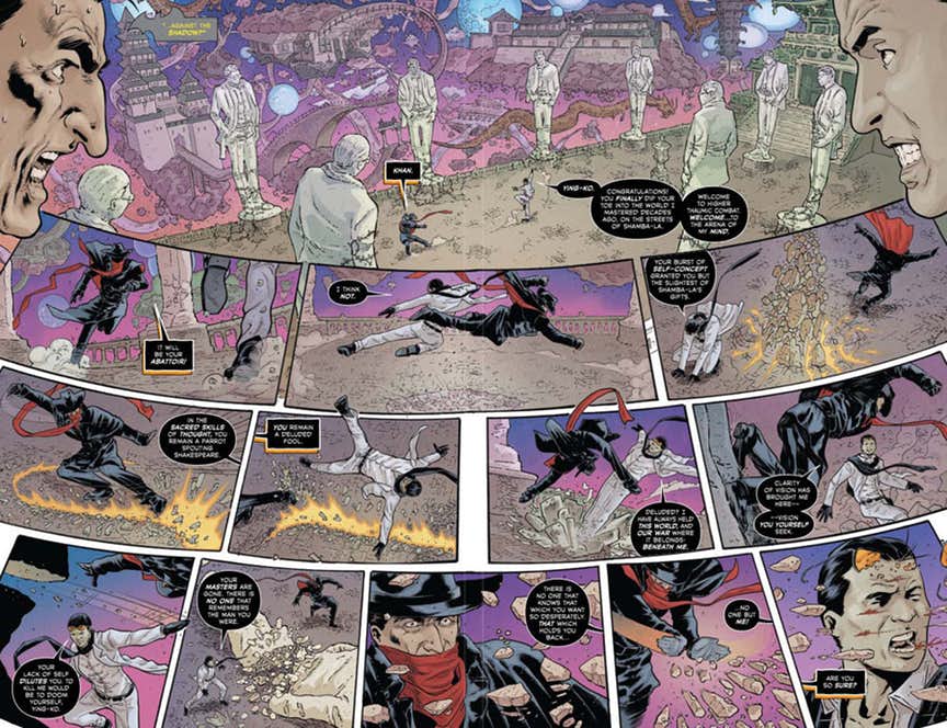 For centuries, the Silent Seven has held Earth in its evil grip…but nothing lasts forever. The Shadow and Batman have infiltrated the Seven’s personal stronghold, hidden off the map and away from history, at great personal cost. They didn’t expect to find one of their own standing against them once they arrived. It’s Robin versus Batman with society itself in the balance as the Shadow steps into the one place even he has feared to go: The Deadly Mind of Shiwan Khan. Can three generations of crimefighting overcome centuries of evil? It’s a crucible they can only overcome through the one thing none of them have: trust.