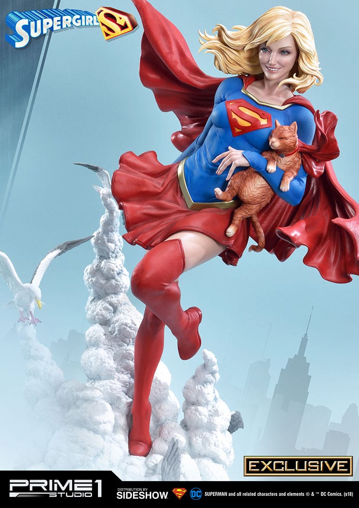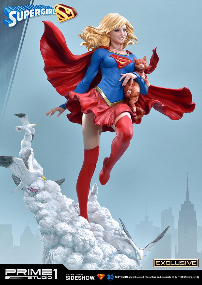 In this statue, Supergirl flies across the sky with one foot gently touching the surface of a cloud with flying birds and fluttering. Her cape shows the airy and windy environment. Her unique pose and sculpt perfectly captures the beauty of Supergirl while holding her pet cat, sometimes referred to as Streaky the Supercat.
