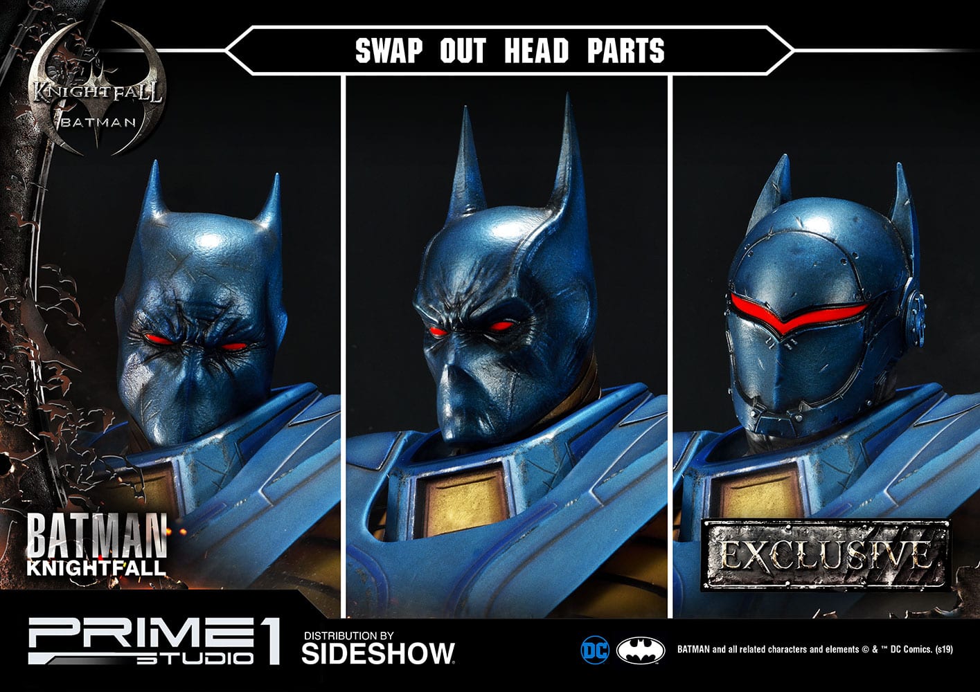 Sideshow and Prime 1 Studio present Knightfall Batman Statue from DC Comics. The character first appeared as a villain who became Batman’s pupil and eventually took over the role of Batman through Knightfall. He is a combination of supervillain and superhero. As the characterization, he often changes his personality from a ruthless assassin, Azrael who was created by the Sacred Order of Saint Dumas to a university graduate student of computer science in Gotham City, Jean-Paul Valley. His transition from villain to hero also influence in his appearance. The Museum Masterline Batman statue adopts a variety of Azrael’s costume styles. He wears a reinvented Power armored Batsuit that has a blue cape and a stylized blue bat symbol on the chest with the accent of yellow and gray color. There is a variety of poses that could be interchanged such as the two sets of gauntlet blades, two alternative portraits to give all the most iconic expression.