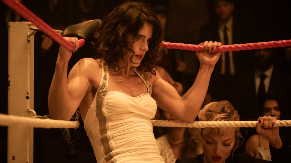 However, Ash Avildsen and the company are smart enough not to reduce Mildred Burke to a woman tormented by a broken relationship. She is defiant every step of the way and unafraid to enter a legal marriage as a means to ensure he can’t screw her and her son over financially. At one point, she also has a championship belt, which becomes another chess piece in this tumultuous relationship-turned-business arrangement. Yes, Billy could book her to lose that belt, and perhaps other women deserve to hold it, but Mildred knows she must transition into shoot mode if anything unplanned or fishy begins happening in the ring. These two become bitter enemies inside and outside the industry, including depicted scenes of domestic violence that, to some, might feel unnecessary to show explicitly, but within this narrative and context depict the difference between in-ring athleticism and terror, causing Mildred to grapple with what message it sends to the audience and what it does to her character if she escapes Billy and expresses public vulnerability.