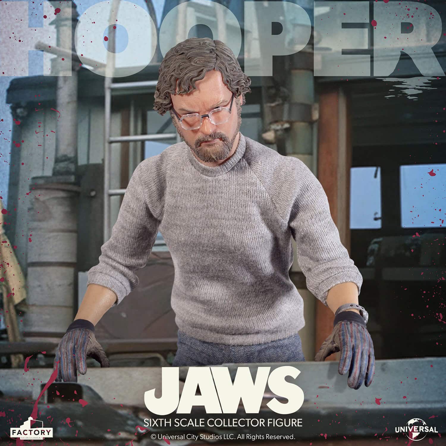 The young scientist is dressed in a denim jacket, weather-worn jeans, and a grey sweater. Hooper includes his iconic frameless glasses, and you can swap his beanie for a sun hat to recreate your favorite movie moments. With a variety of accessories, collectors have plenty of ways to display the figure, including a flotation barrel used to track the great white shark.
