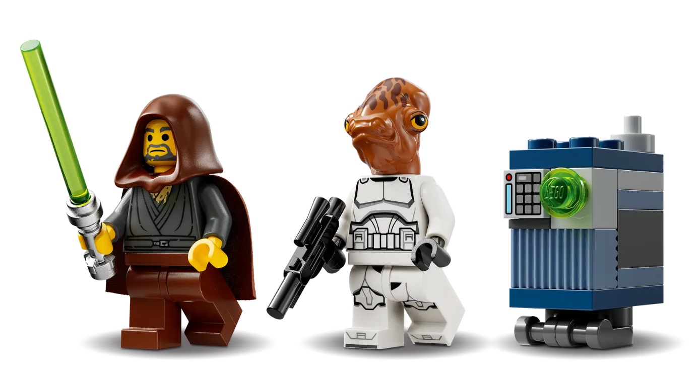 - Building toy featuring 2 LEGO® Star Wars™ minifigures – Jedi Bob with a lightsaber, an Ackbar Trooper with a blaster, plus a Servo (SR-V0) LEGO droid figure