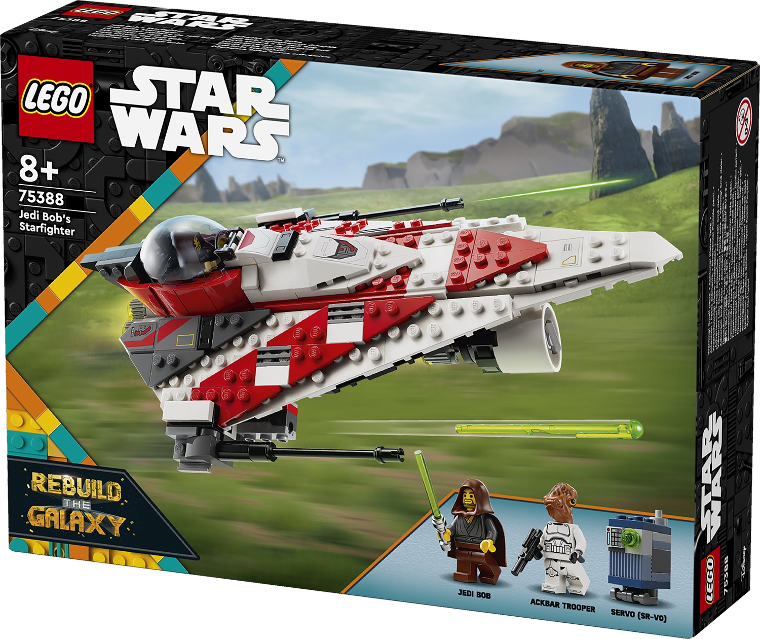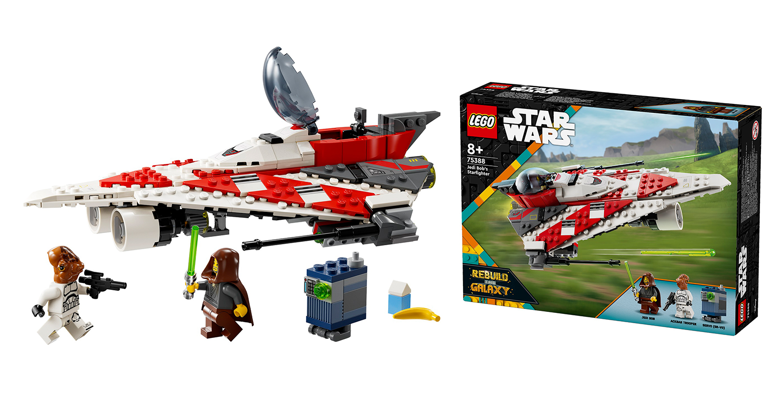 Introduce kids to the mystery character from a 2002 LEGO® Star Wars™ set who became a fan favorite with Jedi Bob’s Starfighter (75388). A cool birthday gift idea for boys, girls and any fan aged 8 and up, this LEGO Star Wars buildable toy set features a starfighter with an opening cockpit, 2 spring-loaded shooters and retractable landing gear. Play out exciting adventures with 2 LEGO Star Wars minifigures: Jedi Bob and an Ackbar Trooper, plus a Servo (SR-V0) LEGO droid figure, as seen in the LEGO Star Wars: Rebuild the Galaxy Disney+ special. Accessories such as Jedi Bob’s lightsaber, which clips to the base of the brick-built starship toy, and a blue milk carton and banana element, which can both be stowed in the storage compartment, add to the fun.