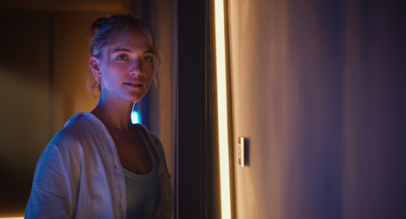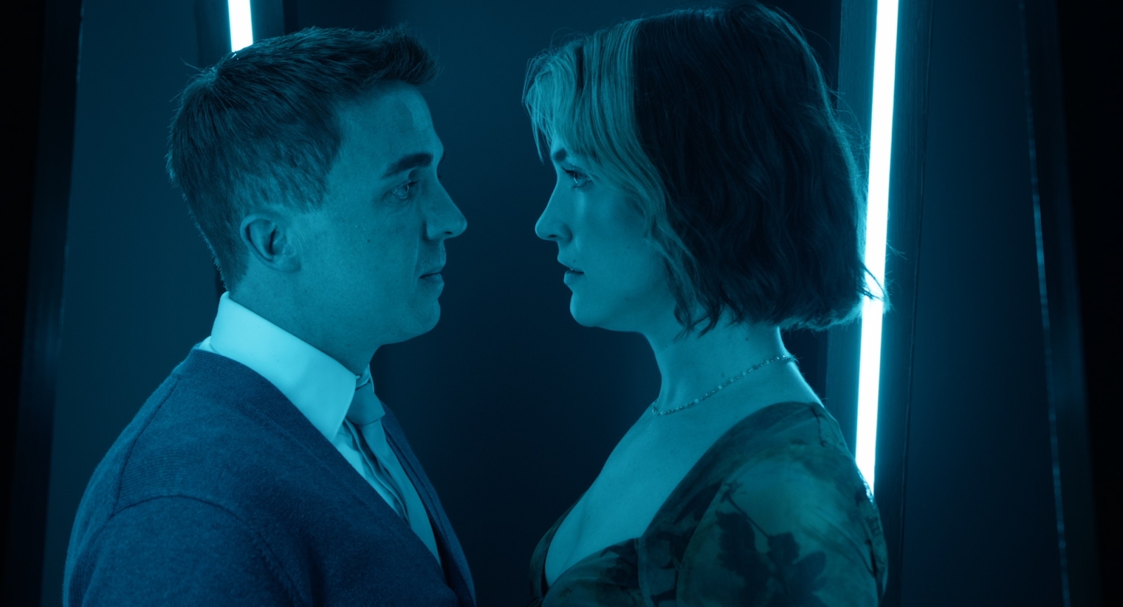 Renner’s new neighbor is the conventionally attractive fitness runner Jamie (Violett Beane), who is warming up to his stunted behavior with the whole dynamic feeling off, most likely intentionally. That’s because the screenplay from David Largman Murray and Martin Medina eventually betrays that sincere interest in exploring these characters, their feelings, and love. As Renner and Jamie continue to connect, meaning they increasingly become more physically intimate, it throws his OCD cleanliness routine into disarray and consistently has him leaving late for work (which means nothing to the viewer since the outside world is never seen here.) Selanus also begins to question Jamie’s motives, potentially getting jealous that he is developing a romantic bond with a human.