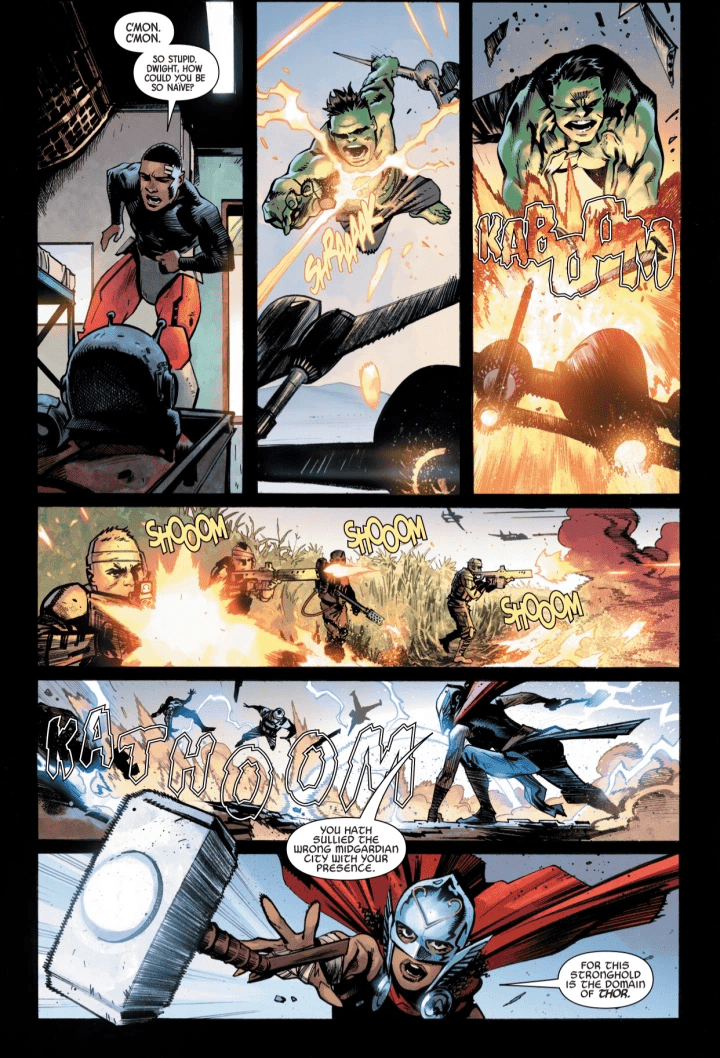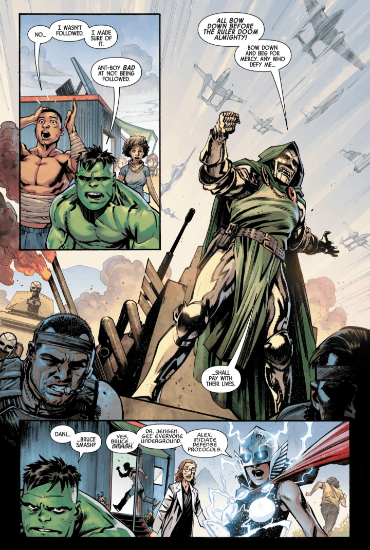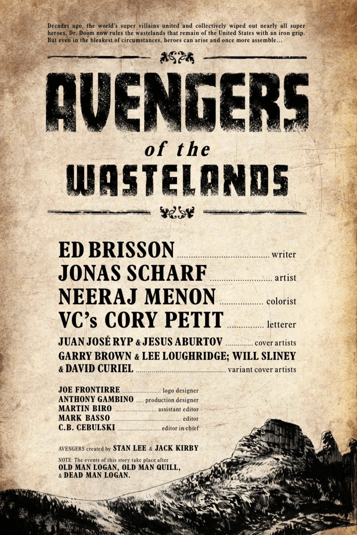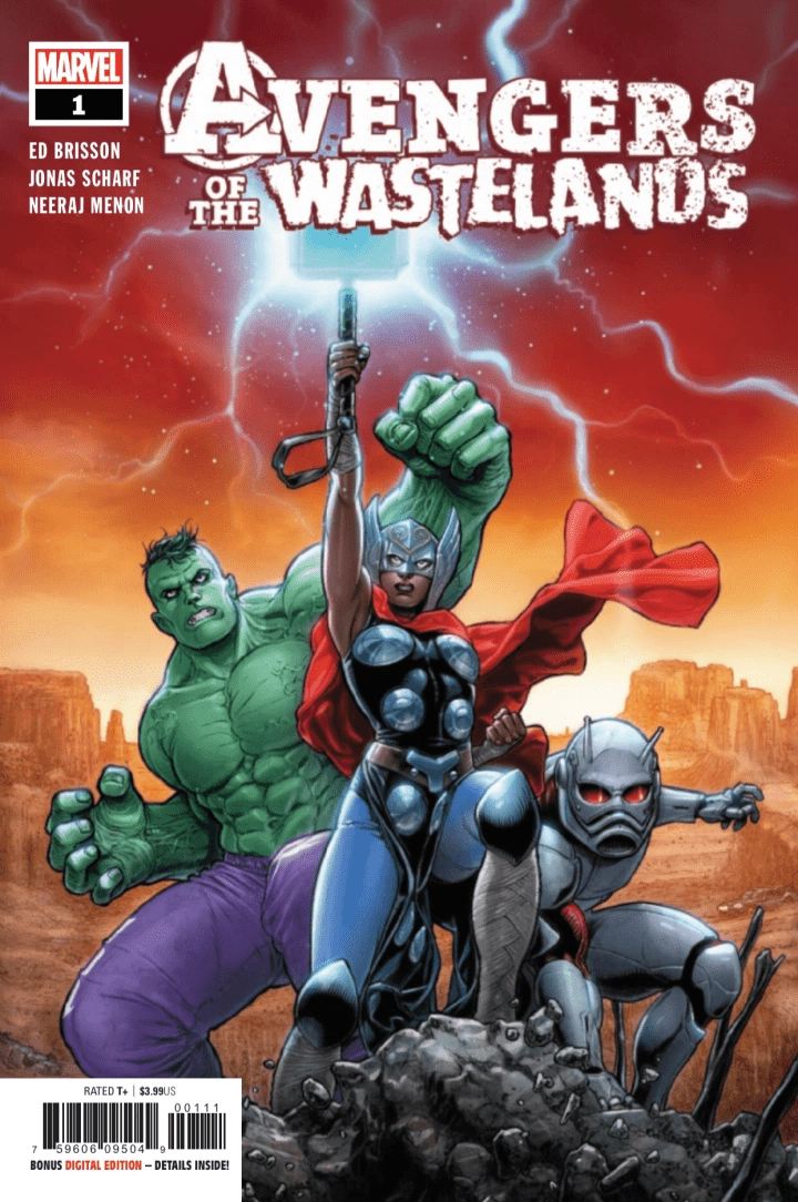 In a world where most of the super heroes fell at the hands of the RED SKULL over fifty years ago, a new force rises in the Wastelands! DANI CAGE wields the mighty Mjolnir for the cause of peace, but when the brutal regime of DOCTOR DOOM forces DWIGHT (a.k.a. the owner of the surviving Ant-Man technology) to Dani and HULK in a last ditch effort to survive, the AVENGERS may ASSEMBLE once more! Spinning out of the saga begun in OLD MAN LOGAN, and following up OLD MAN QUILL and DEAD MAN LOGAN, this is the can’t miss premiere of Ed Brisson and Jonas Scharf’s magnum opus!