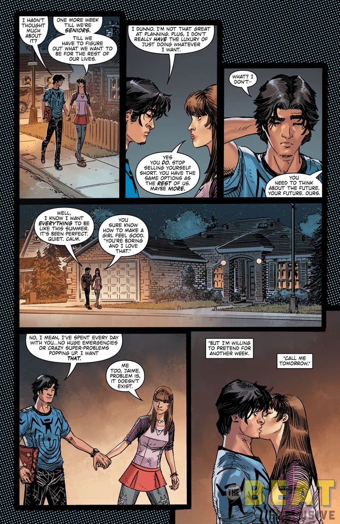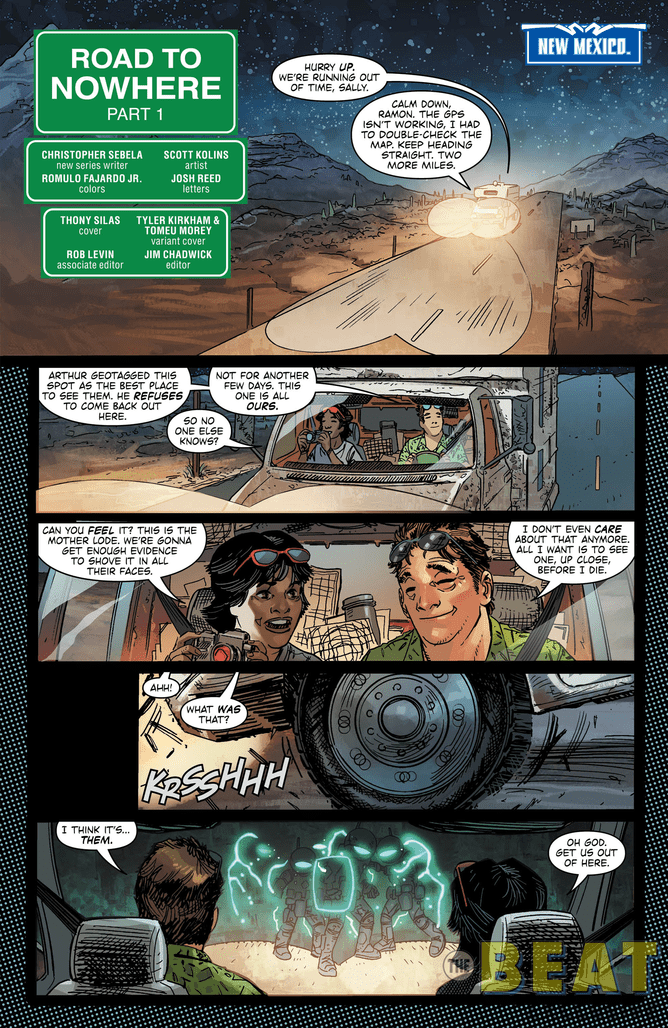 NEW CREATIVE TEAM! Following recent events in El Paso, Jaime and his friends decide to take a spontaneous road trip through the desert. But the scarab still exerts its influence, and inevitably, it will to lead Jaime into danger, this time in the form of a U.F.O. Will Jaime be forced to reveal his identity as Blue Beetle to his new girlfriend?