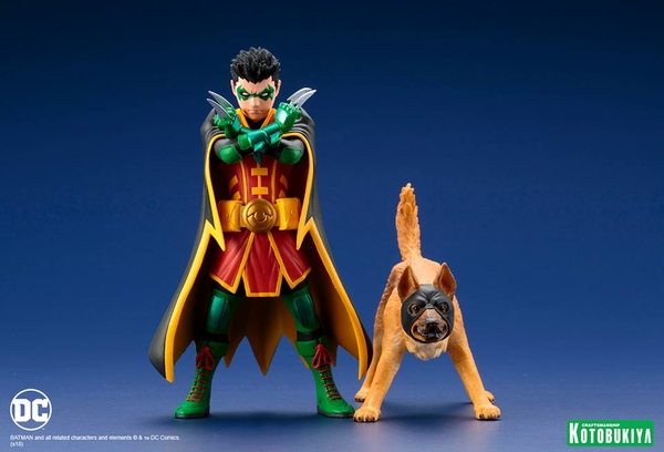 A Kotobukiya Japanese import! The expansive DC Comics ARTFX+ collection from Kotobukiya returns for its next installment to the exciting Super Sons monthly comic book series starring the children of Superman and Batman in their own heroic adventures. While Jonathan Kent and Krypto take to the skies, the shadows are the domain of ROBIN AND ACE THE BAT-HOUND!