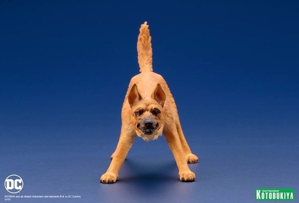 A boy with a complicated home life, Damian Wayne is the son of Bruce Wayne and Talia al Ghul. His father only learned of his existence after Damian spent a number of years training with the League of Assassins, and Damian can be even more cold and detached than Batman. Robin joins the ARTFX+ Statue series in a small but truly imposing package, standing in a wide-legged stance and holding batarangs at the ready. The fifth Robin’s costume is of course a combination of red, yellow, green, and black like his predecessors, and features combat boots, armored plates, reinforced gloves, a utility belt, and scalloped cape. Damian completes the look with a vicious expression on his face along with a green mask and short, spiky black hair. Robin’s faithful companion is Ace the Bat-Hound, a brown canine of indeterminate breed who’s just as aggressive as his human. The Ace figure crouches with his tail and ears held straight up, head pointed forward, and teeth bared. And he wouldn’t be the Bat-Hound without a black mask!