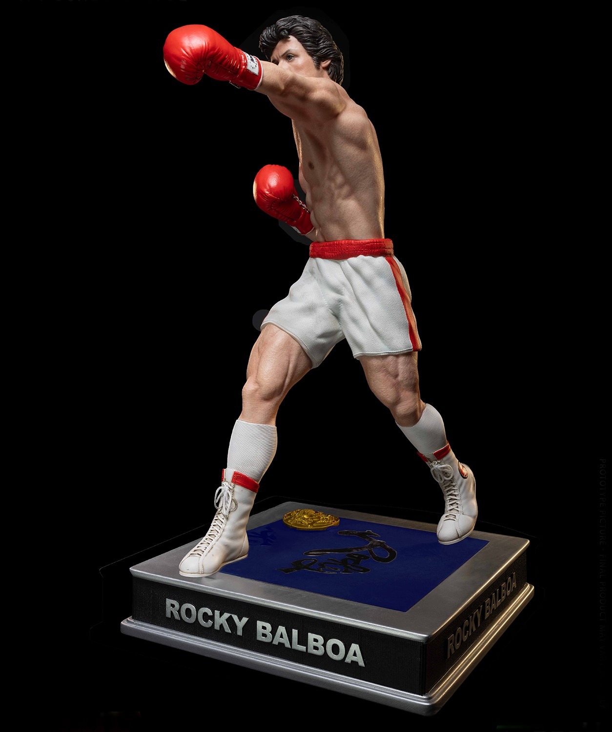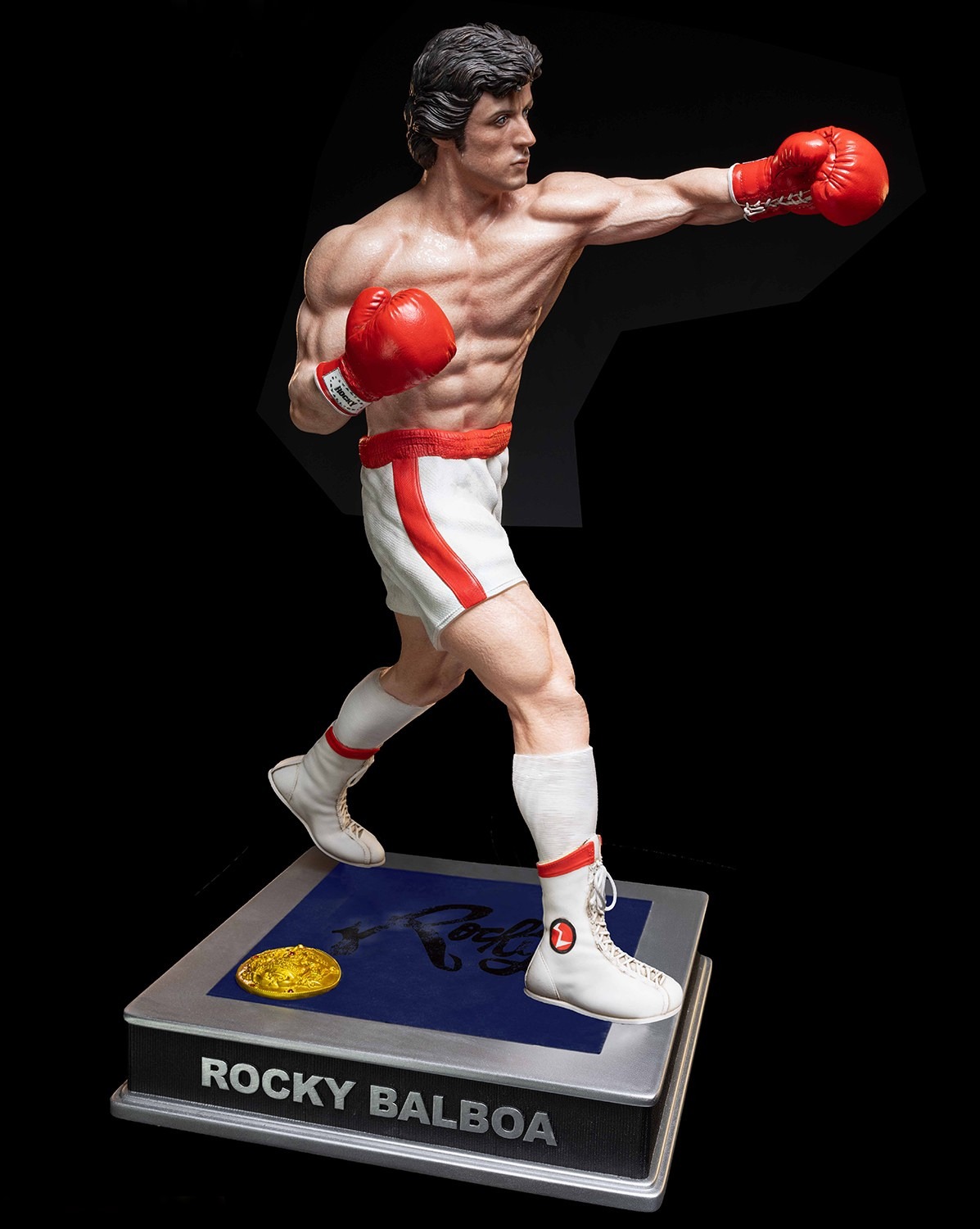 Standing approximately 50cm tall, this meticulously crafted piece captures the essence of the legendary boxer featuring Rocky in his iconic shorts from the first epic fight in ROCKY.