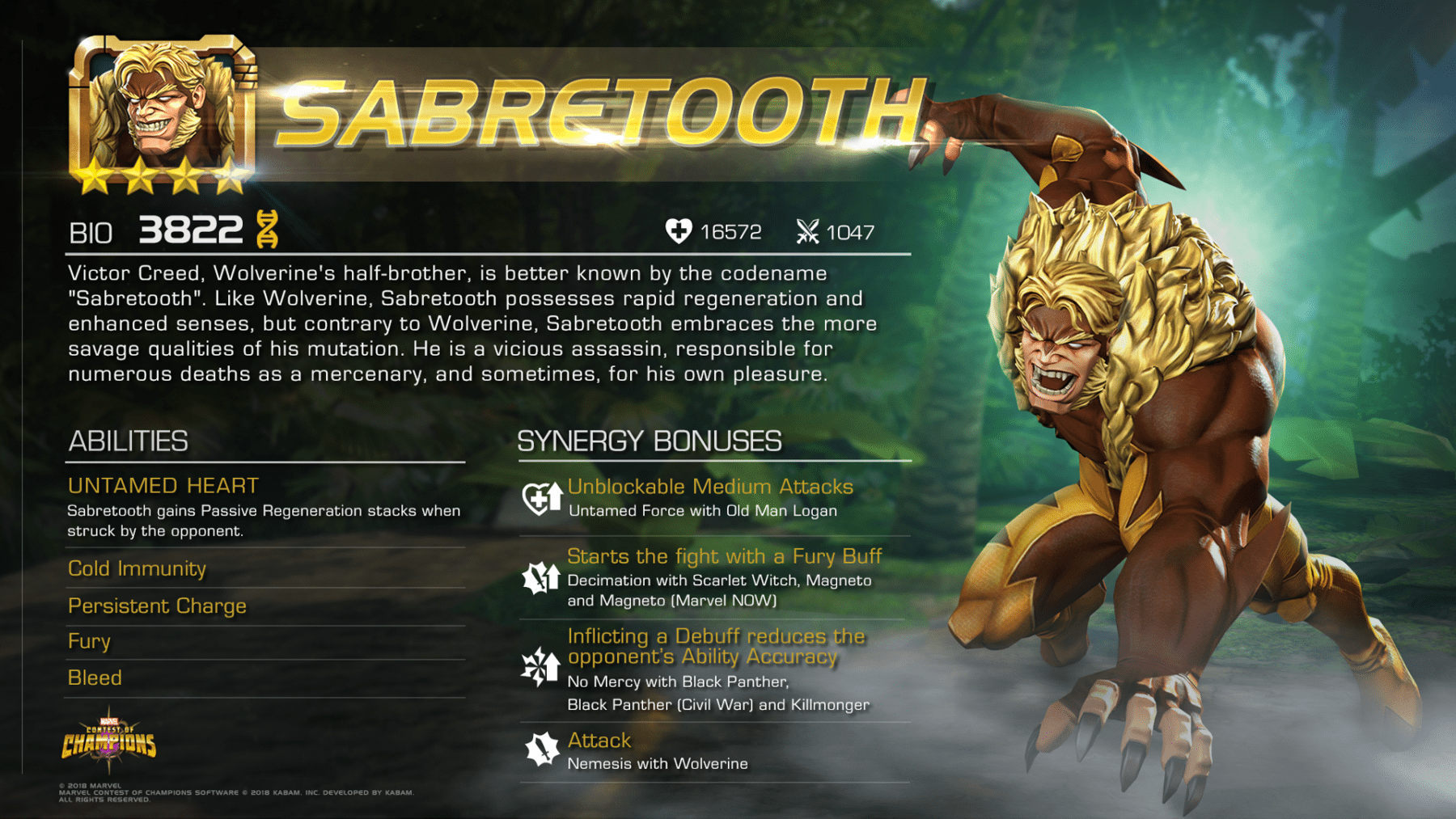 Wolverine’s half-brother Victor Creed – a.k.a. Sabretooth – has arrived in Kabam’s Marvel: Contest of Champions. Check out his gameplay trailer, bio and stats and abilities below…