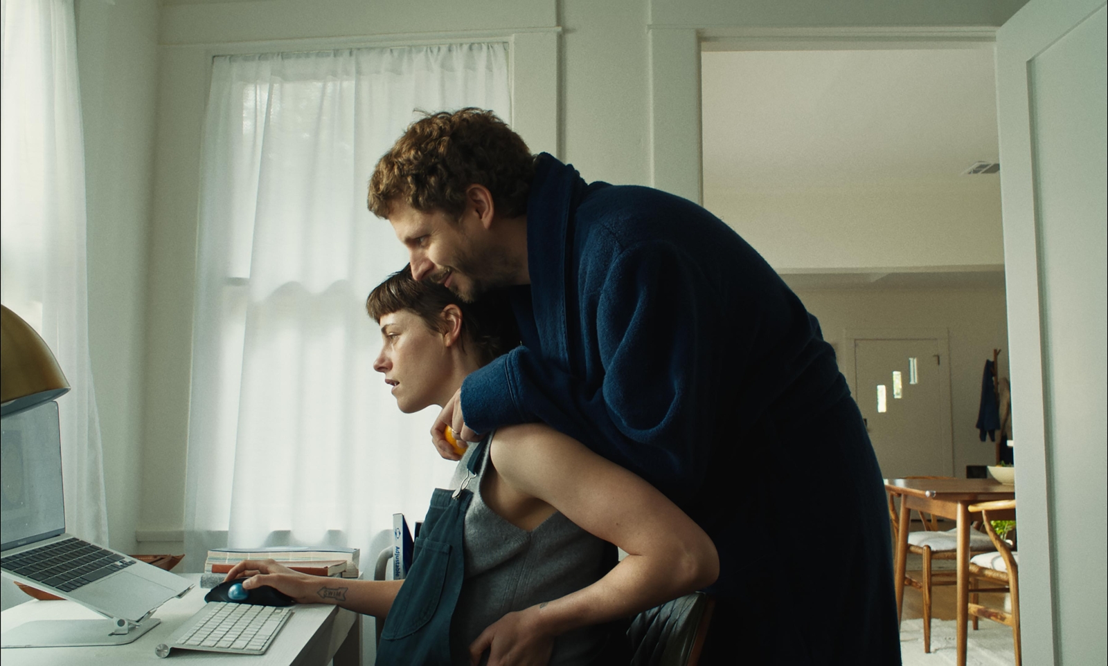 When Rickey (director/co-writer/co-lead Michael Angarano, putting on a solid neurotic Kieran Culkin impression) drops by unannounced to see his estranged best friend Glenn (Michael Cera), he tries to get his attention by climbing and making gestures in a backyard tree. Unamused by what Glenn deems childish, his pregnant wife Rosie (Kristen Stewart) points out, “You’re the one on the floor hiding from him.” It shows that Sacramento (co-written by Chris Smith) is about two emotionally stunted friends, eventually trying to help one another in life. There is also a scene where the definition of “projection” comes up, with Rickey and Glenn arguing who is doing the projecting. It’s clear they are both a bit lost and need to straighten each other out.