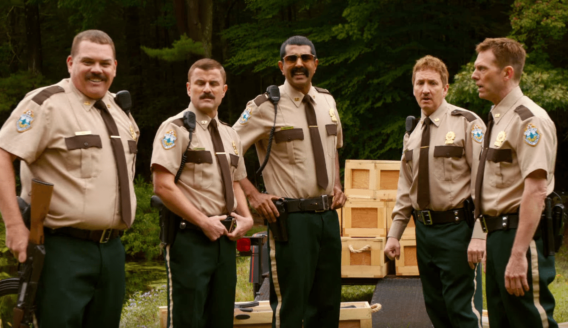 Penned by the group Broken Lizard (Erik Stolhanske, Jay Chandrasekhar, Steve Lemme, Paul Sotor and Kevin Heffernan) the story unfolds out of the central culture clash. Alternately, it leans into and tilts away from American and Canadian stereotypes. The blundering back-and-forth between the Mounties and the Troopers serves as a great engine for the ensuing absurdity.
