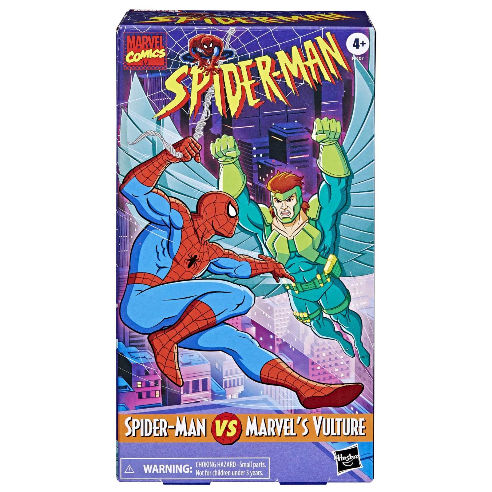 An aging engineer consumed by vanity, Adrian Toomes, a.k.a. Vulture, attempts to steal Spider-Man’s powers — and his youth. Bring the excitement and wonder of the Marvel Universe to your collection with this Hasbro Marvel Legends Spider-Man & Marvel’s Vulture 2-Pack. These collectible 6-inch-scale Marvel figures are detailed to look like Spider-Man & Marvel’s Vulture from the 1994 Spider-Man: The Animated Series. Fans can display this 6-inch action figure set — featuring poseable heads, arms, and legs — in their Marvel action figure collections. Spider-Man includes 2 sets of alternate hands, as well as alternate unmasked Peter Parker and Flash Thompson portrait heads. Marvel’s Vulture features a set of alternate hands, an alternate head, and 4 wing parts. This 2-pack comes in unique vintage-style VHS-themed closed box packaging with series-inspired logos and design.