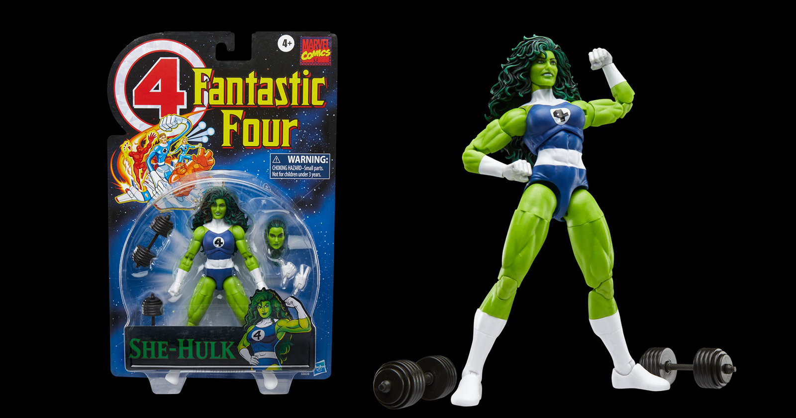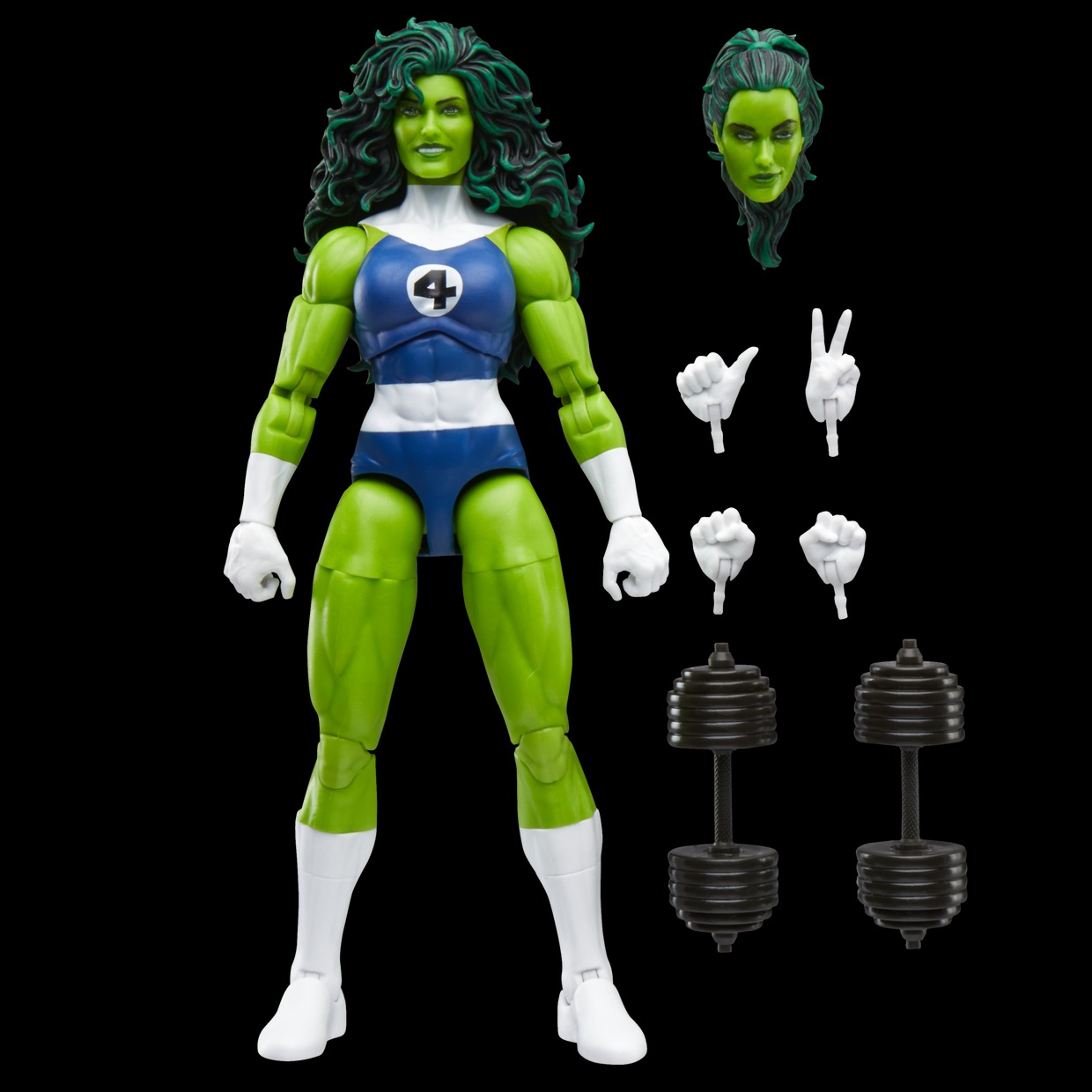 Bring the excitement and wonder of the Marvel Universe to your collection with Hasbro Marvel Legends She-Hulk figure! Detailed to look like the character’s appearance in Marvel comics this collectible 15 cm scale Fantastic Four figure is fully articulated with premium design and poseable head, arms, and legs. This Marvel action figure set comes with 7 accessories, including 4 alternate hands, 2 dumbbells, and alternate head. Hasbro Marvel action figures’ 15 cm scale make them great for posing and displaying in fans’ collections. Reimagine comics-inspired scenes from classic Fantastic Four comics on your shelf with Marvel Legends action figures and Marvel collectibles.