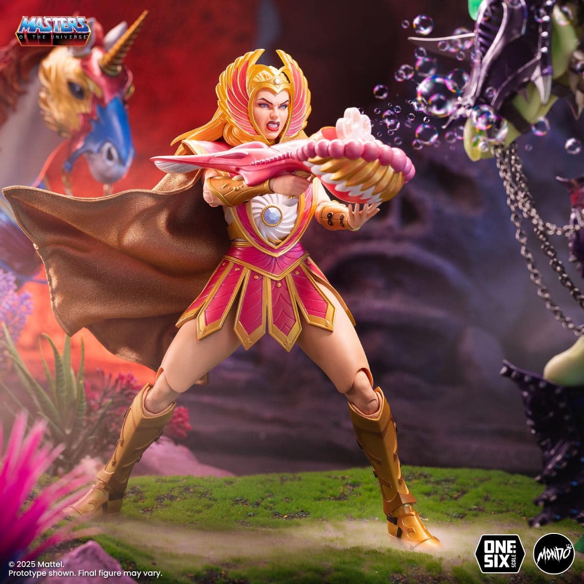Essentially three figures in one, our Masters of the Universe™ – She-Ra™ Deluxe 1/6 Scale Figure – Timed Edition features three distinct looks including classic animated series and toyline outfits, plus Bubble Power mode with incredible Bubble Power Blaster!