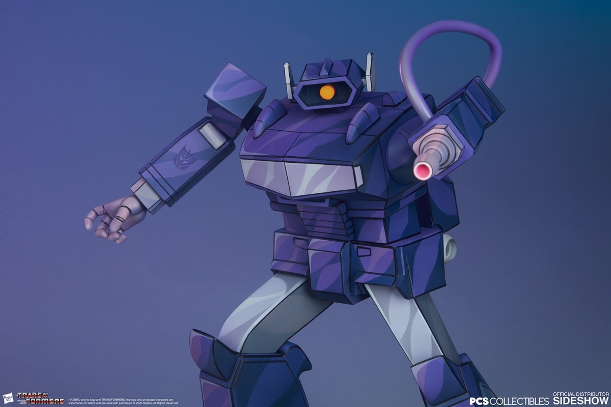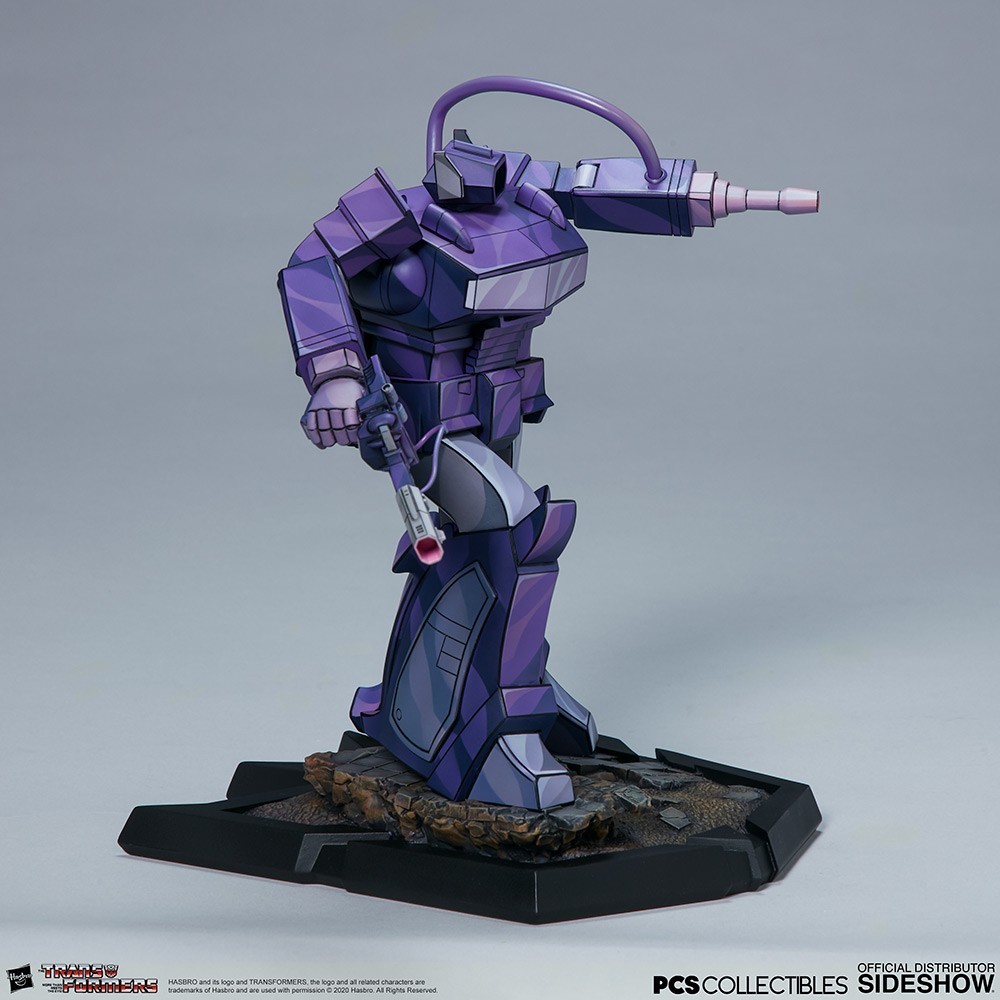 The Shockwave Classic Scale Statue measures just over 9” tall on a rubble-covered Decepticon logo base. This cold and calculating enemy of the Autobots aims his arm cannon, ready to defeat his emotion-driven enemies with logic and strategy.