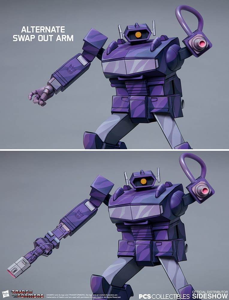 The Shockwave Classic Scale Statue features a unique cel-shaded deco application that captures the iconic two-dimensional style of the Generation 1 Transformers cartoon as a three-dimensional collectible. Shockwave is detailed with purple and grey tones as well as orange and pink accents on his central eye and weaponry, recreating his distinct animated appearance with expert detail. The statue also includes two swappable right arms, one with a gesturing hand and one grasping a purple blaster weapon.