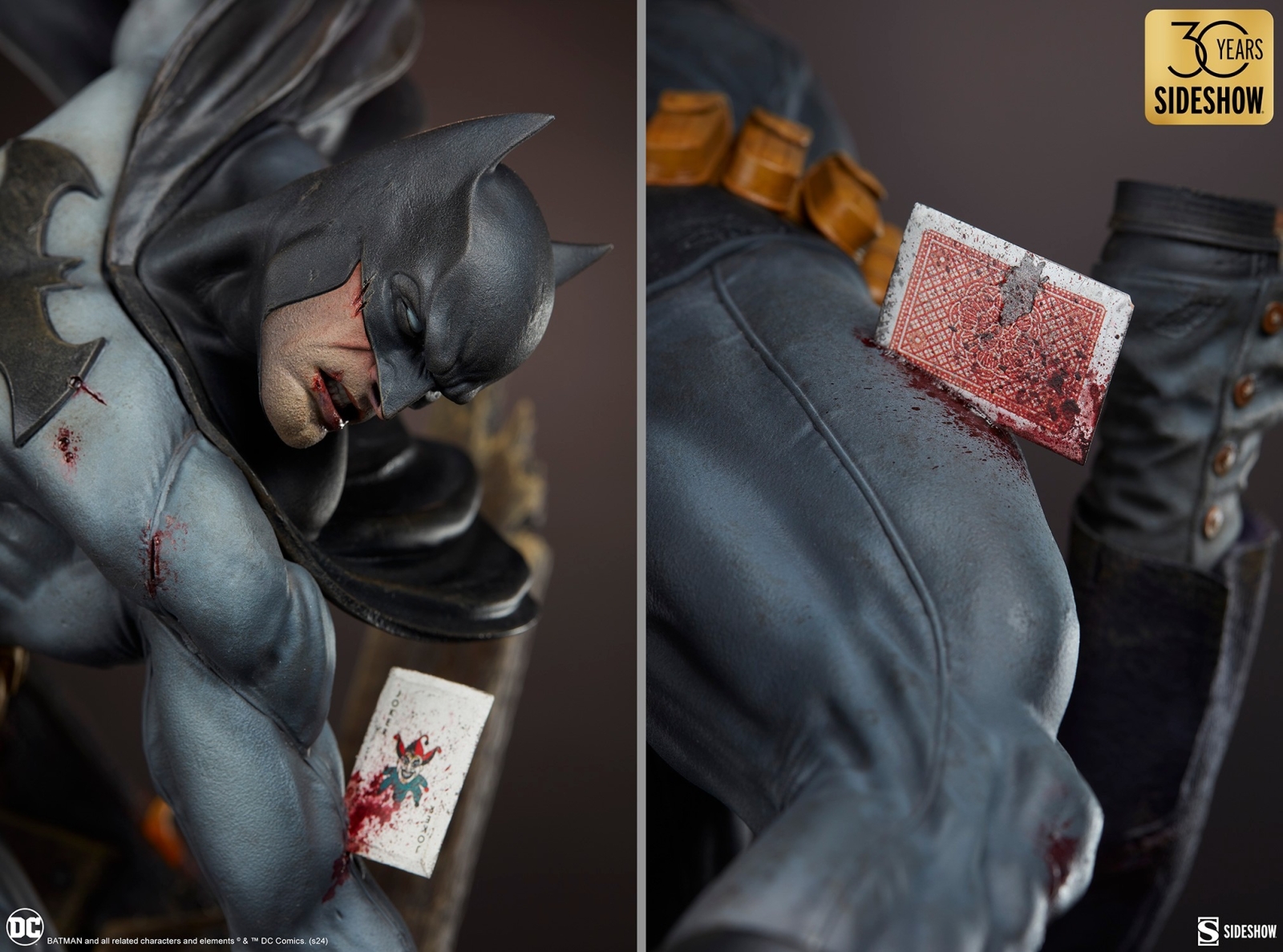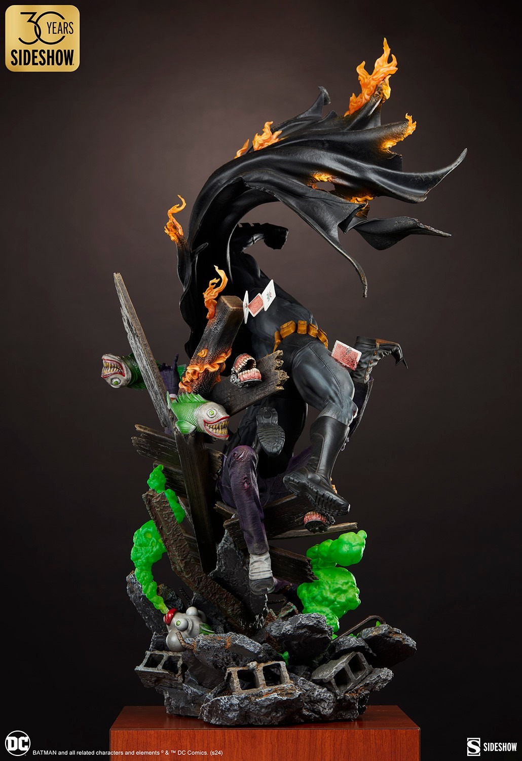 Measuring 32” tall, 18.3” wide, and 16.2” deep, the Batman vs Joker: Eternal Enemies Premium Format Figure traps two longtime rivals in an endless conflict of their own creation — and an endless freefall through an abandoned building. With his black cape burning and his fists and face bloodied, Batman prepares to land a brutal punch. The Joker, as messy and maniacal as ever, holds a trigger and an equally terrifying fish. Razor-sharp Batarangs, colorful playing cards, hidden knives, and green gas, all detritus of their ongoing war, litter the scene alongside rubble from the broken ceiling and floorboards. Will Batman save the day or will The Joker ruin it? Gotham City may never know in this ceaseless contest.