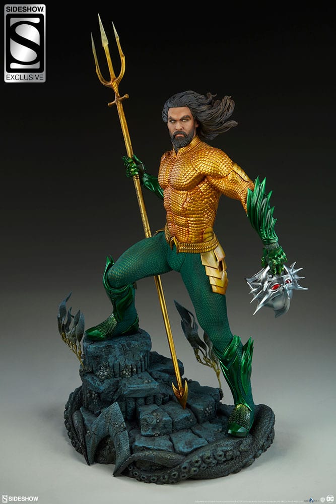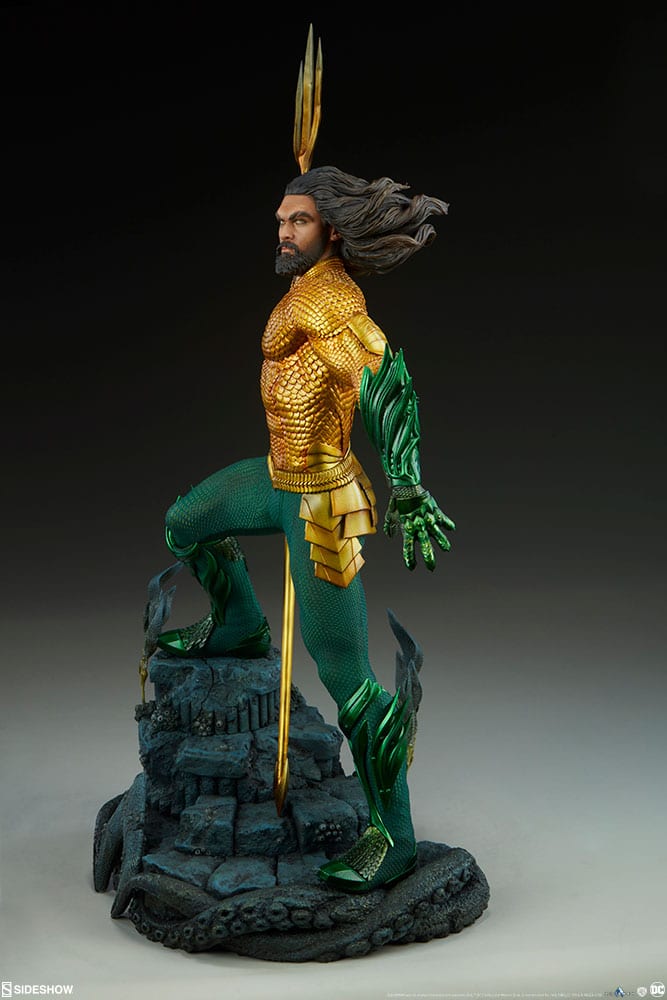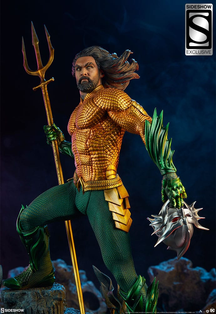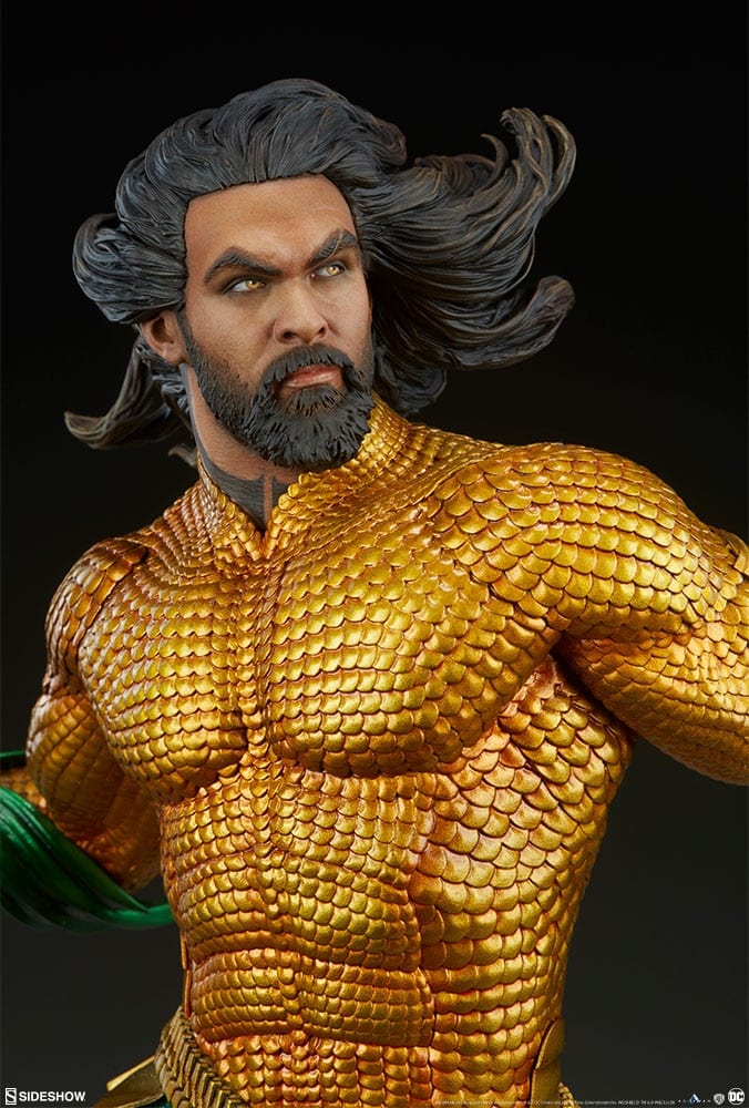 The Aquaman Premium Format™ Figure measures 25” tall, capturing the majesty of the aquatic DC Comics hero as he appears on the silver screen. Painstakingly sculpted based on Jason Momoa’s likeness from the film, his lifelike portrait features golden eyes and flowing hair to represent his heroic undersea presence.