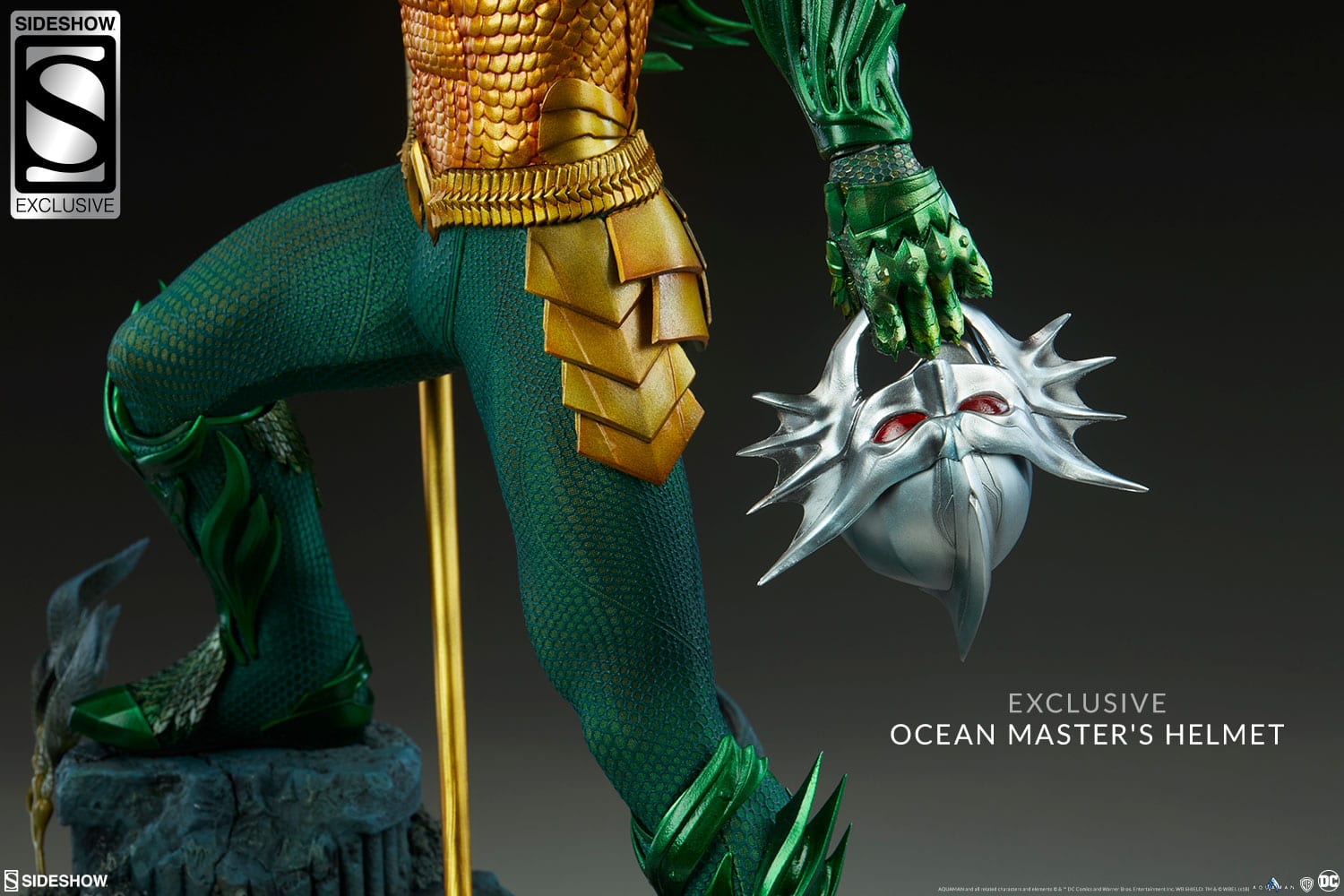 The Exclusive Edition of the Aquaman Premium Format™ Figure includes a swap-out left hand holding Ocean Master’s helmet. With a shining silver helm, pointed fins, and red eyes, this undersea trophy makes a tidal-ly exciting additional display option for your statue.