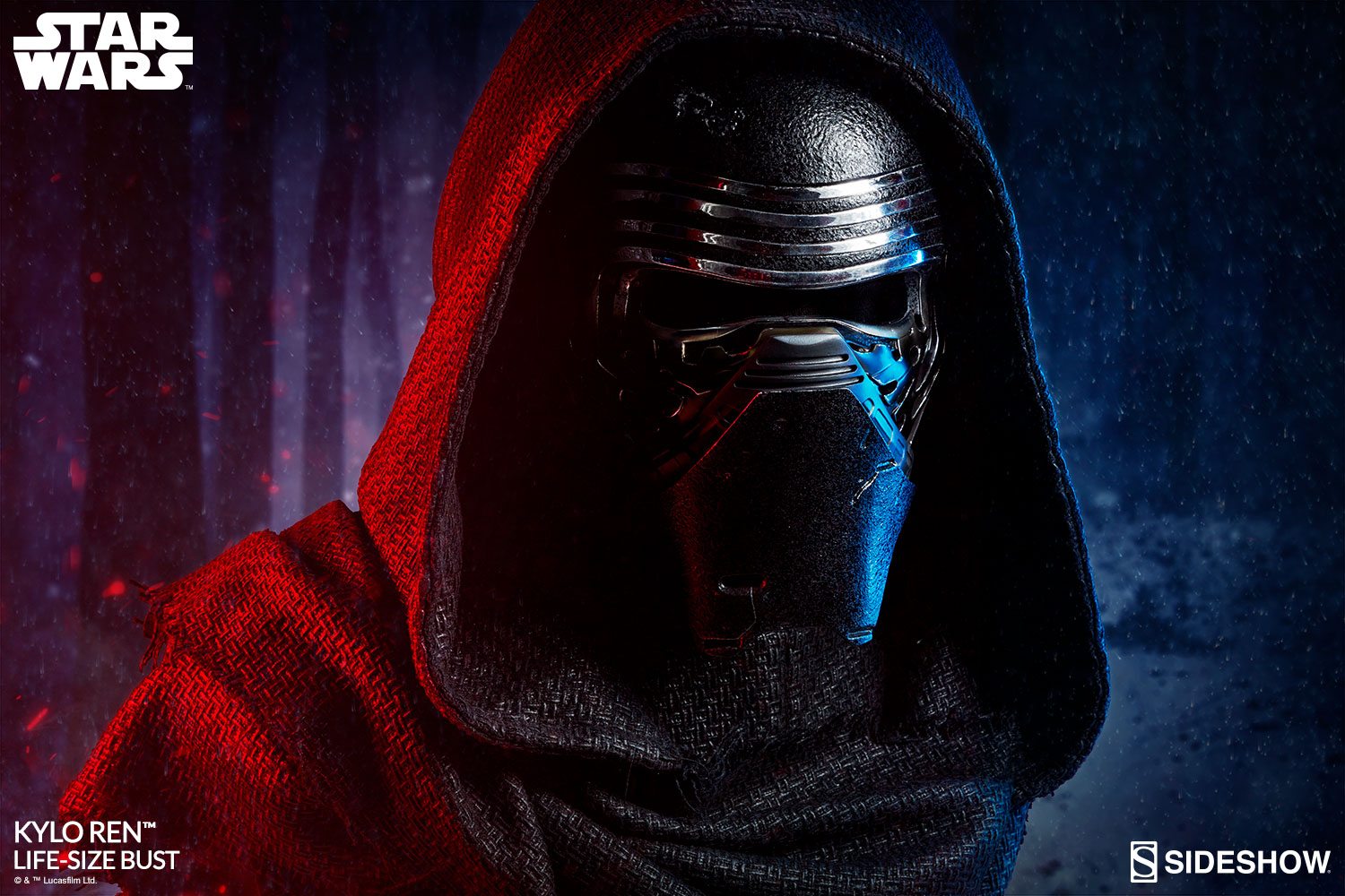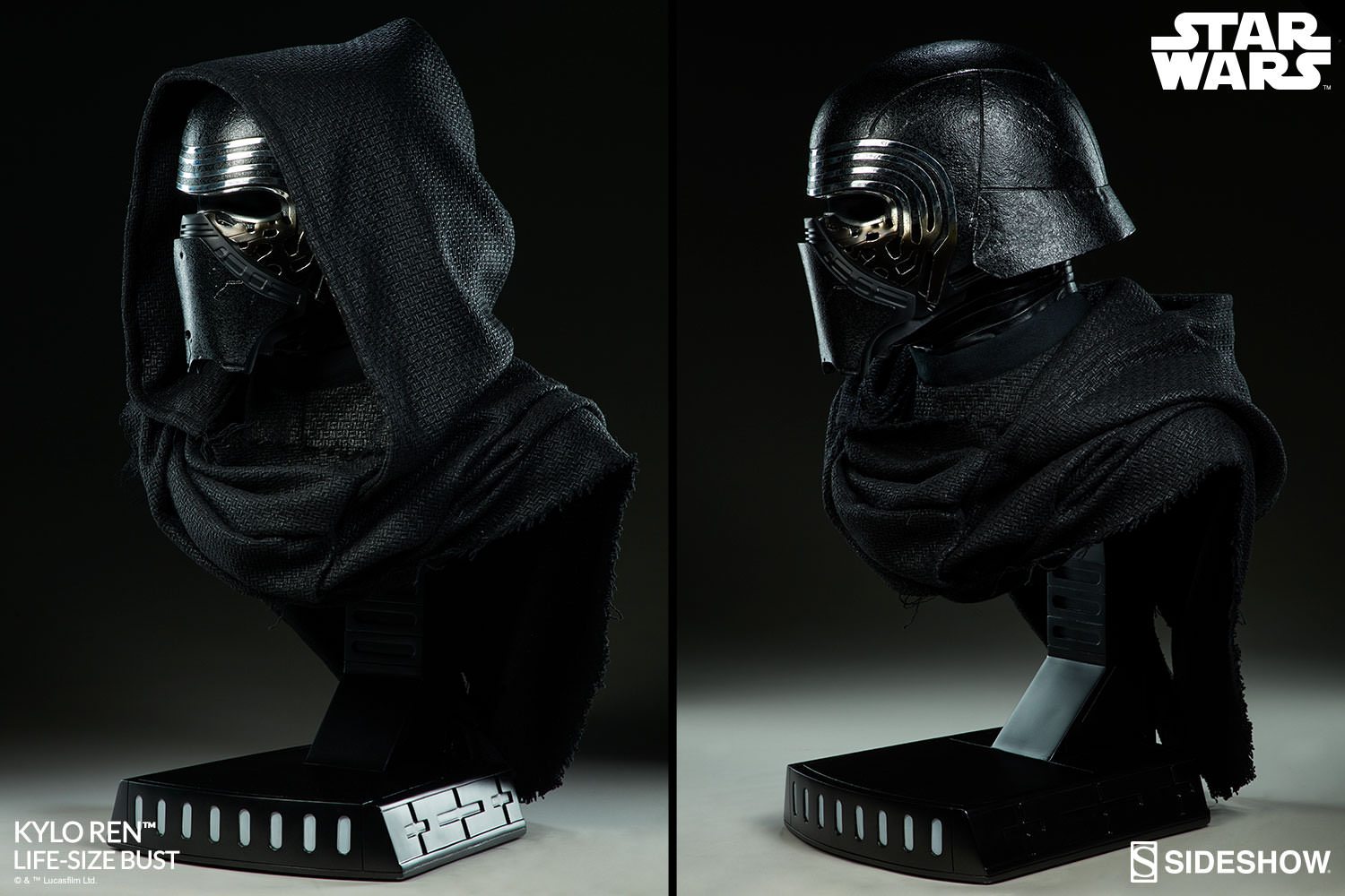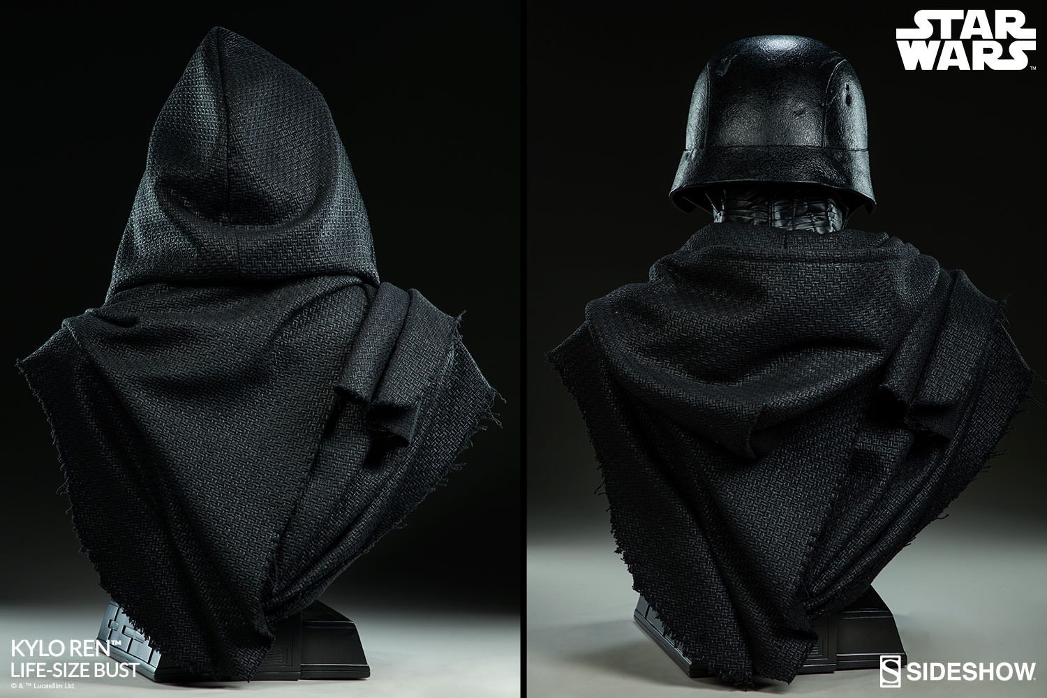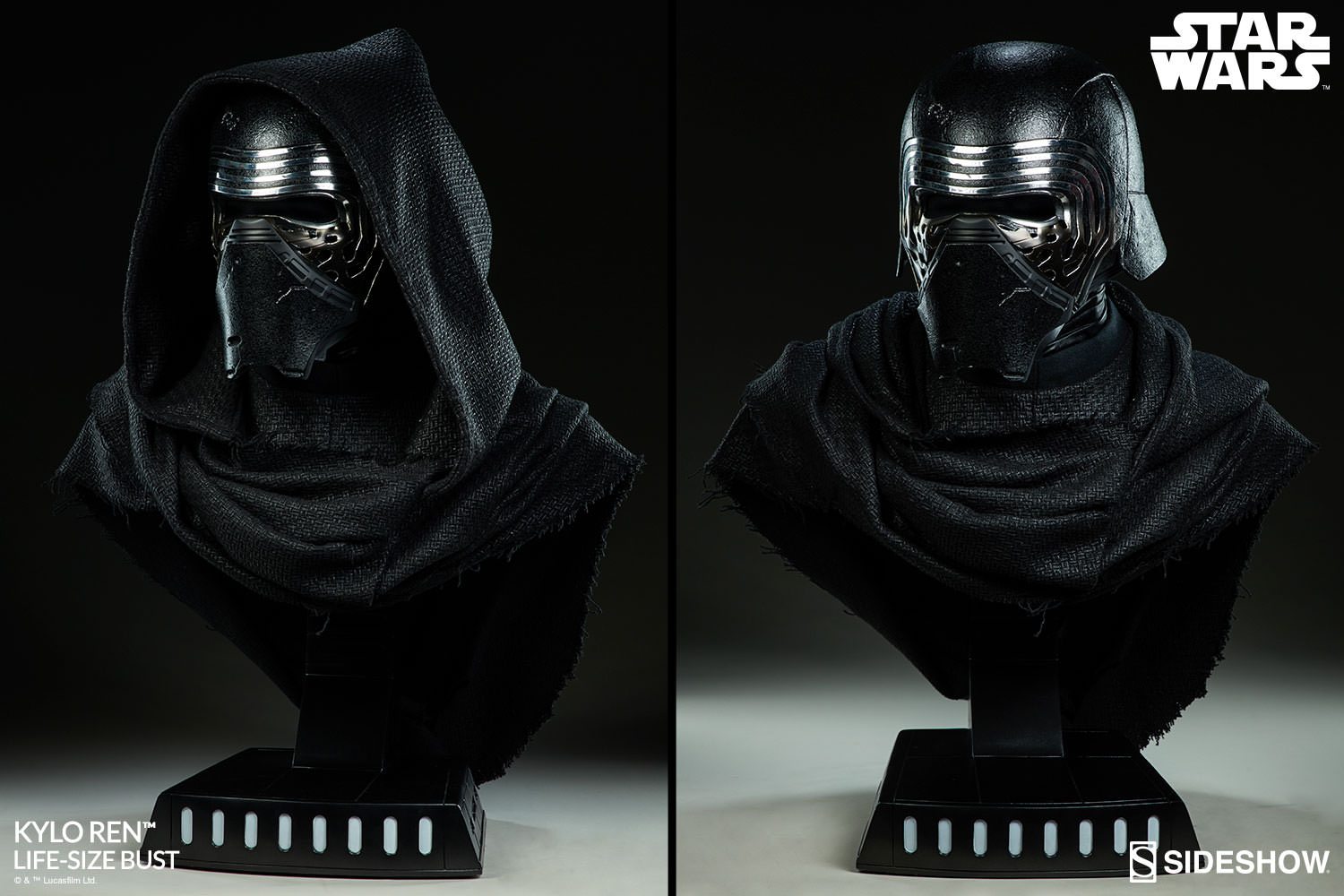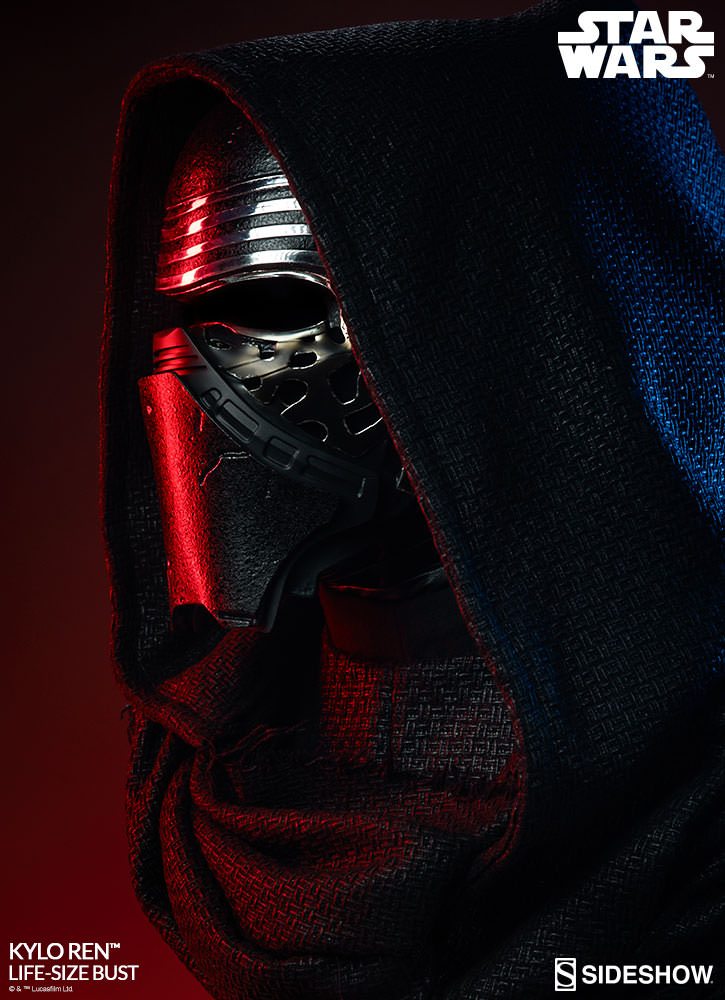 Kylo Ren has tailored fabric garments, with the textured material forming the hood and cloak at his shoulders. The Kylo Ren Life-Size Bust can be displayed with the hood up or down, allowing you to customize your ultimate Star Wars display. Feel the dark side of the Force and add the Kylo Ren Life-Size Bust to your collection today!