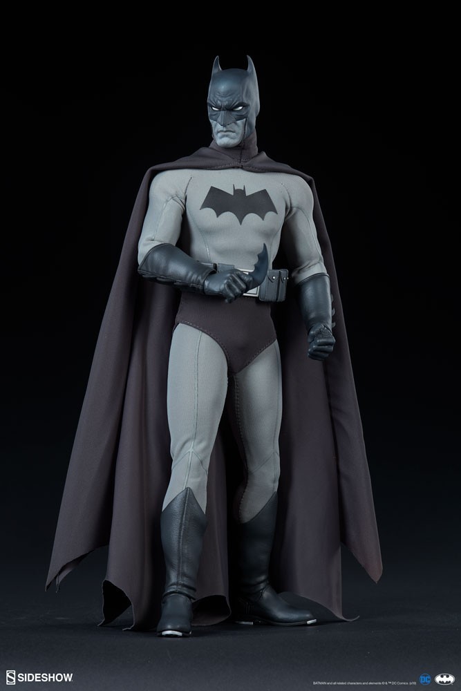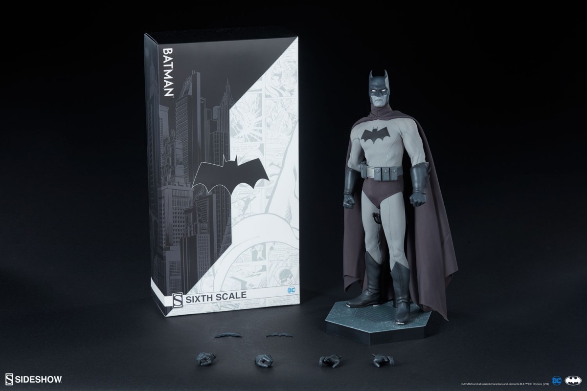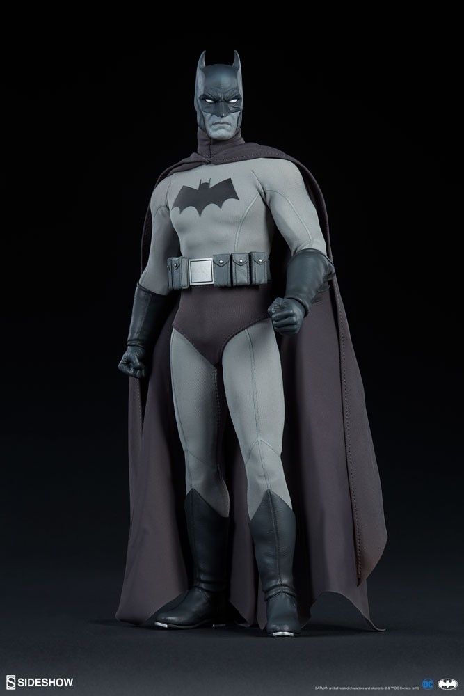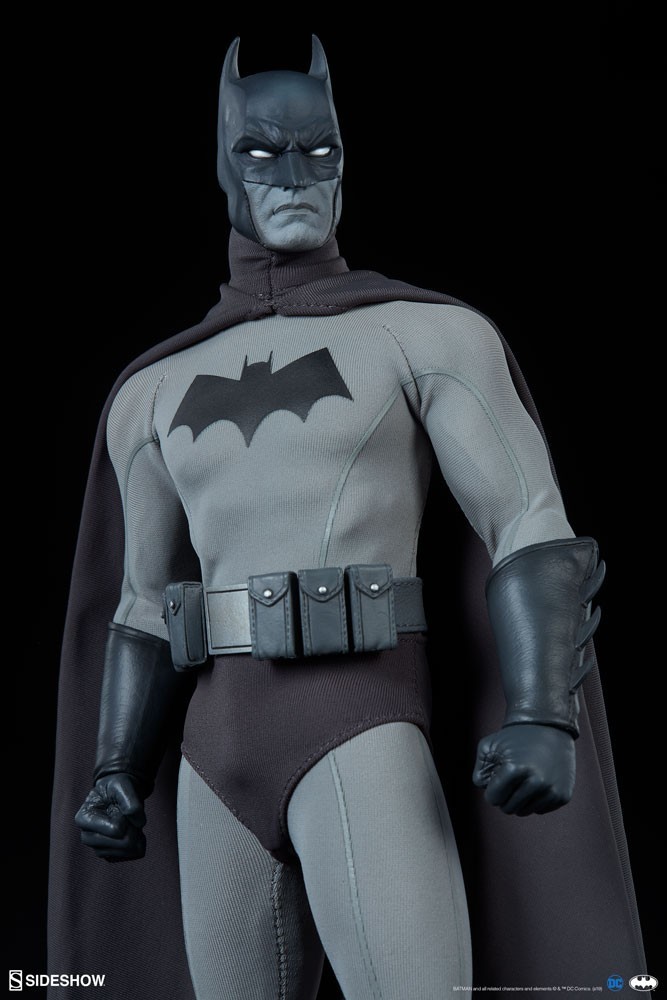 He has become one with the night. The Batman (Noir Version) Sixth Scale Figure is cloaked in a tailored fabric Batsuit that gives Bruce Wayne a unique monochromatic appearance. His costume features a grey undersuit with the bat-symbol on the chest, along with dark briefs and his signature bat wing cape. He also wears a pair of black sculpted boots and a pair of ridged gauntlets, along with a grey utility belt. Batman’s head sculpt is inspired by his comic book appearance, wearing a stylized cowl with white eyes creating the iconic silhouette of Gotham City’s vigilant defender.