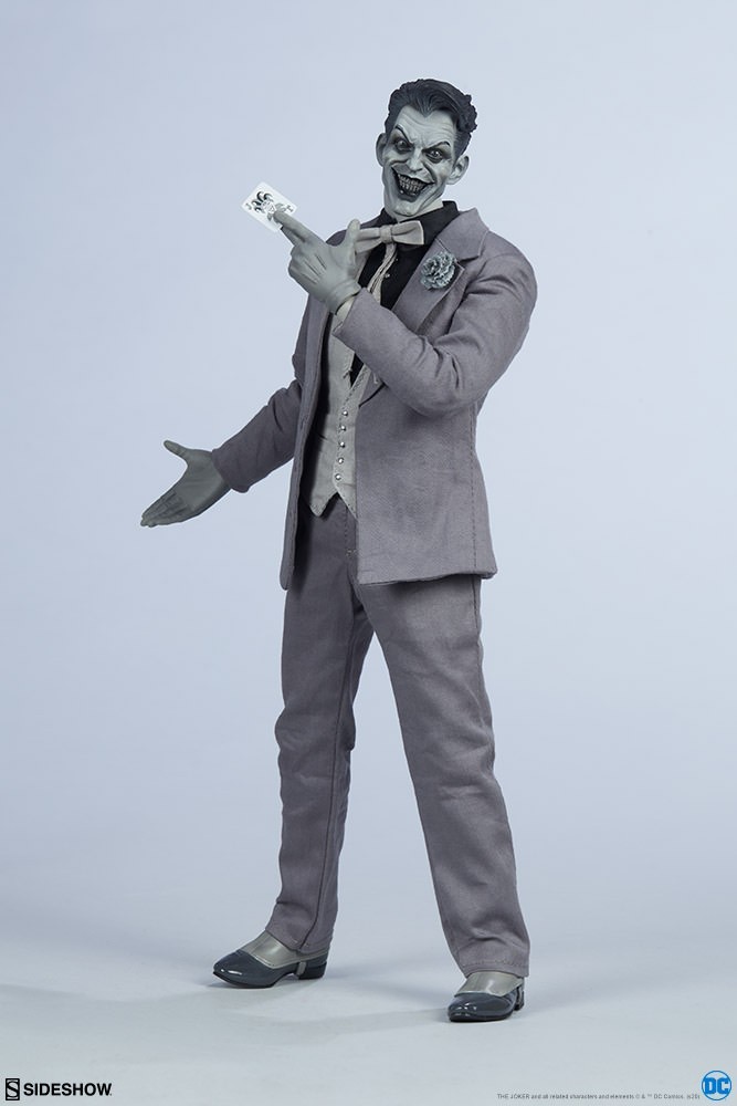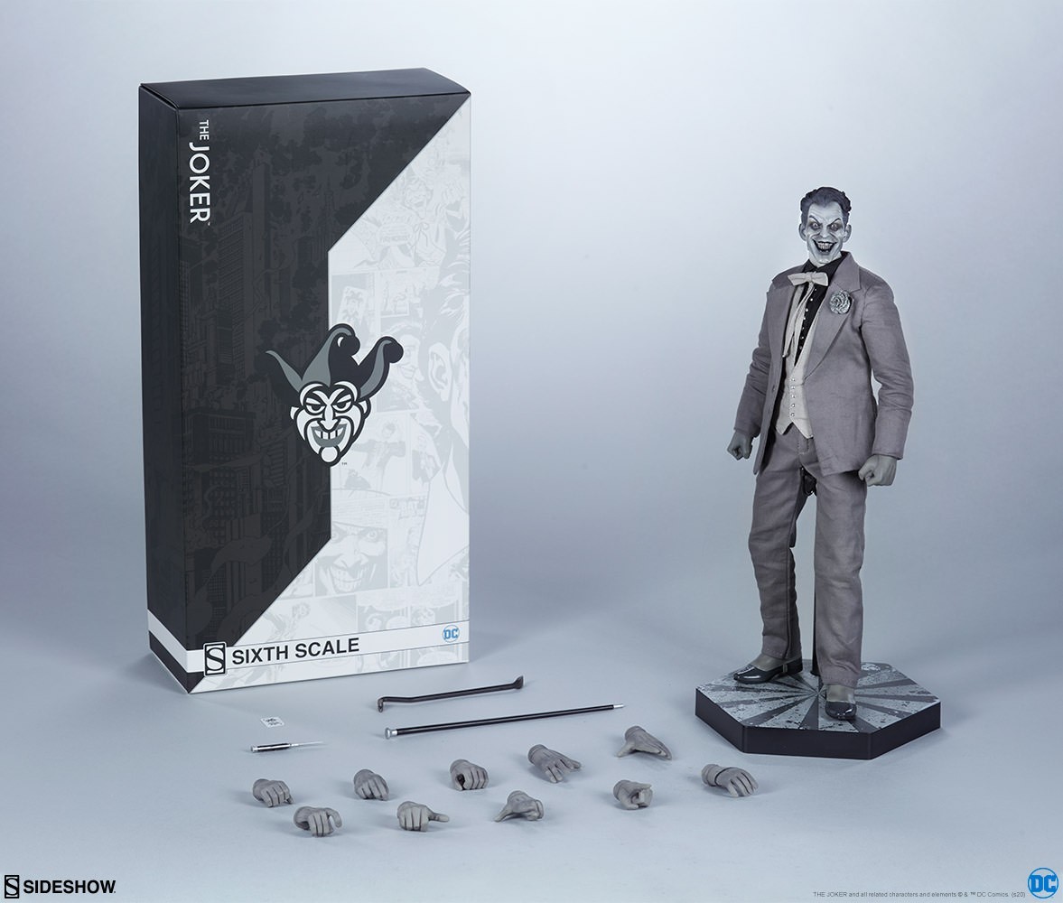 The Joker Sixth (Noir Version) Scale Figure features an intricately tailored costume in dapper black, white, and grey tones, giving the Clown Prince of Crime a uniquely vintage appearance. His costume consists of a fabric suit jacket and pants, a vest, a dress shirt, and a bow tie. He also has a sculpted lapel flower, shoes with sculpted spats, and ten different gloved hands; a pair of grip hands, a pair of fists, a pair of card-holding hands, and additional hands for pointing, holding his cane and gun, and a hand with a gag buzzer.