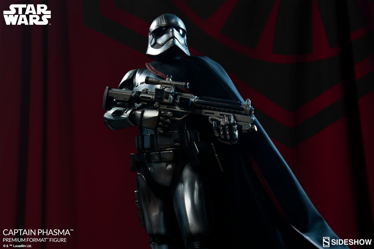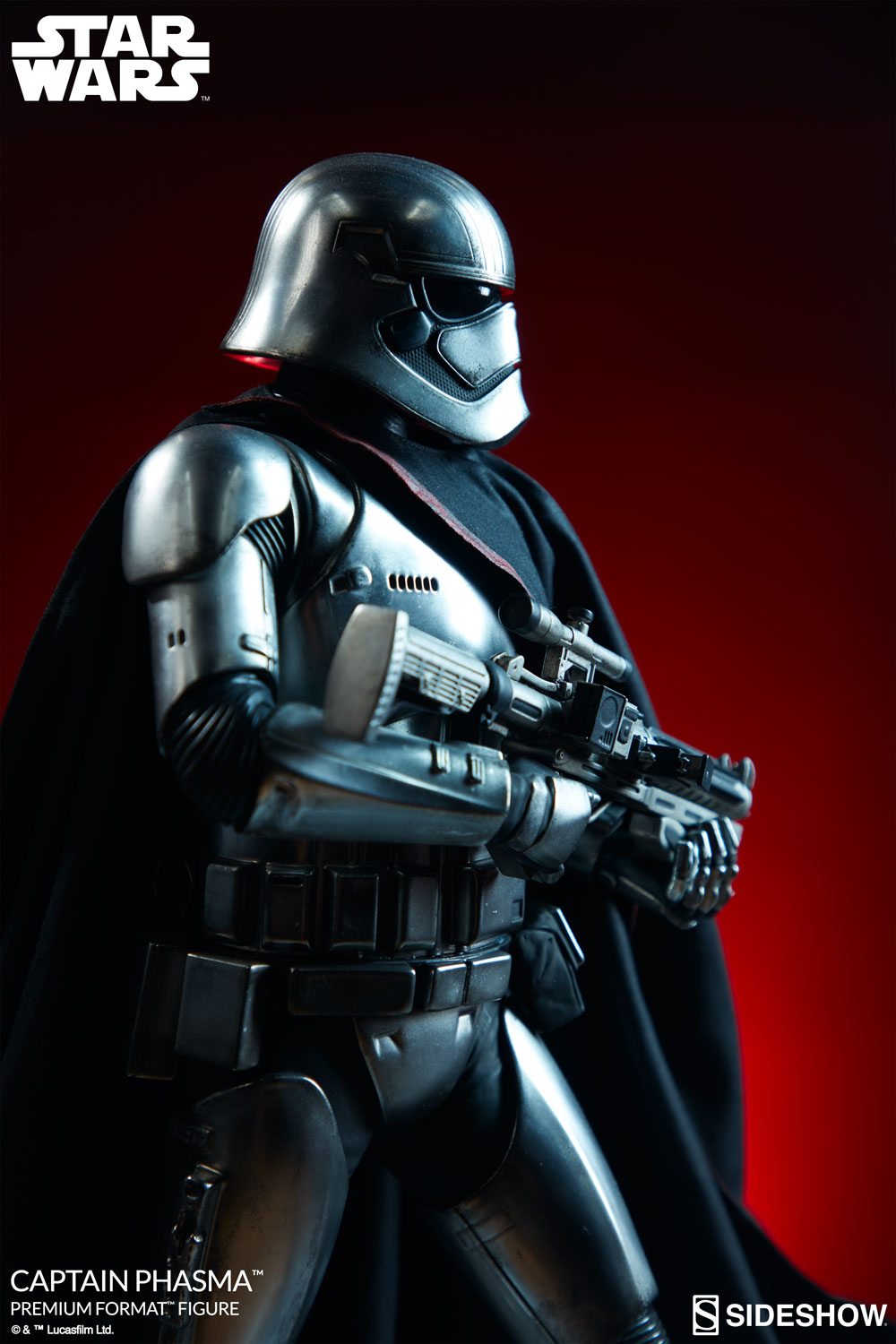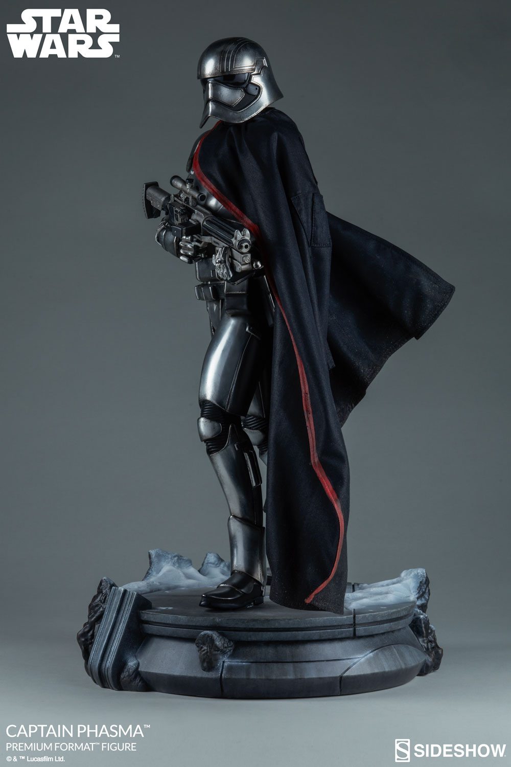 Her unique silver Stormtrooper armor is faithfully recreated here, and the Captain Phasma Premium Format Figure has detailed weathering to capture the tough, rigid exterior of this veteran First Order officer. Phasma is gripping a blaster rifle, prepared to crush the Resistance with her unwavering resolve.