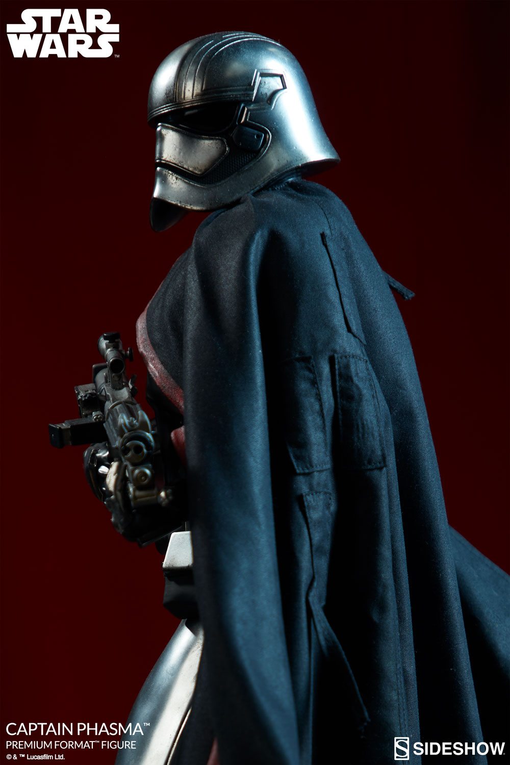 Captain Phasma’s black fabric cape is draped menacingly off her shoulder. It is adorned with red trim to add a bold stroke of color to her striking look from the films. The cape is also wired to allow for custom poses on the fabric piece.