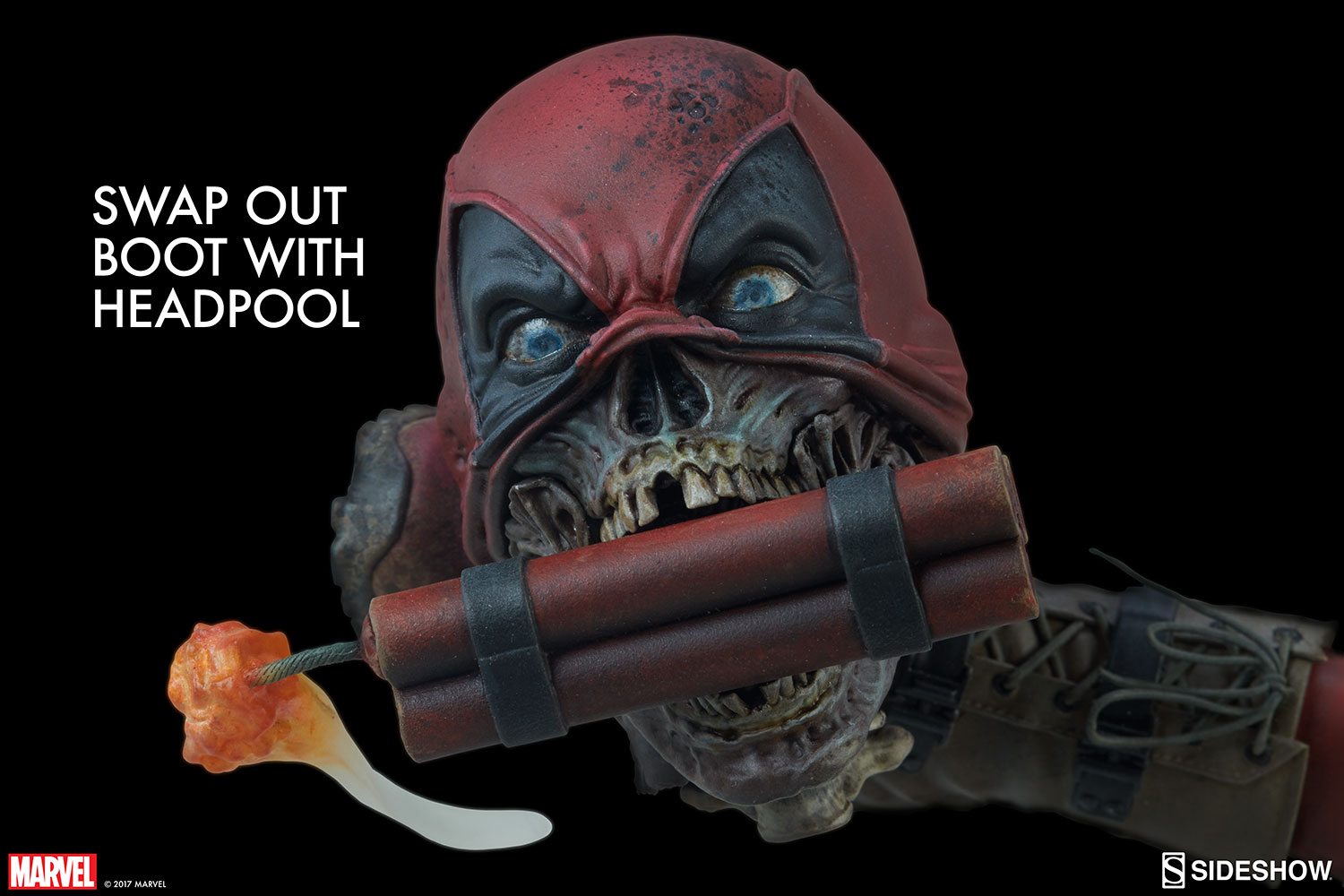 With no time to use anything but maximum effort, she is posed precariously kicking a missile in midair while she slices a bullet in half with her katana. She hasn’t even had to fire her gun yet and she’s already tearing the place apart. With an exciting swap-out, she can kick the high-flying Headpool into action, armed to the teeth with explosive dynamite. KABLAM!