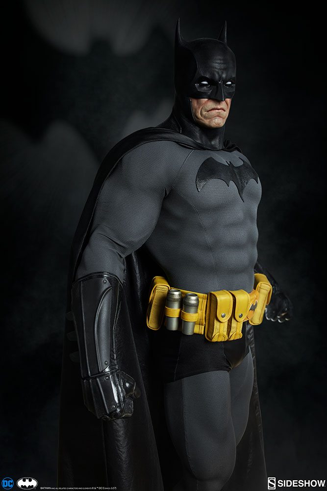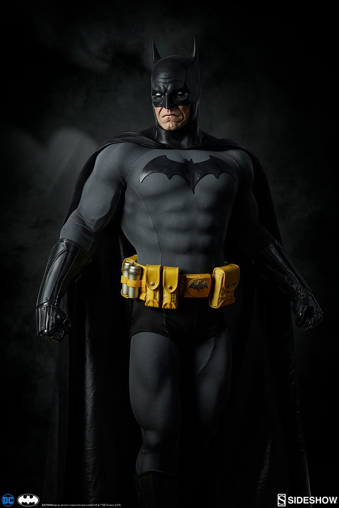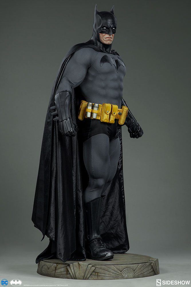 Based on his comic book appearance, the Batman Legendary Scale Figure has a grey and black costume adorned with a yellow utility belt and his ever-present bat insignia on the chest. The solitary crime fighter is clad in a fabric cape, standing in a powerful pose as he emerges from the shadows to confront evil in his city.