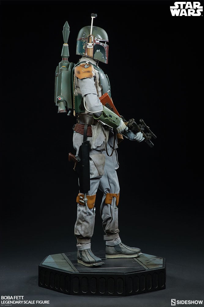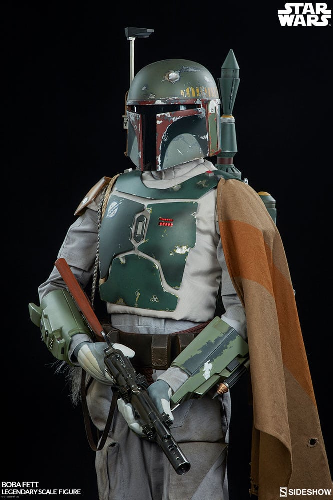 The Boba Fett Legendary Scale™ Figure mixes highly-detailed sculpture with custom tailored fabric elements to recreate his iconic, battle-worn Mandalorian armor with incredible accuracy. The figure includes synthetic hair Wookiee scalps draped over his shoulder as trophies of his professional reputation. Boba Fett is crafted out of fiberglass, ABS, and cloth elements, and includes a light-up feature on the bounty hunter’s chest plate for an additional display option.
