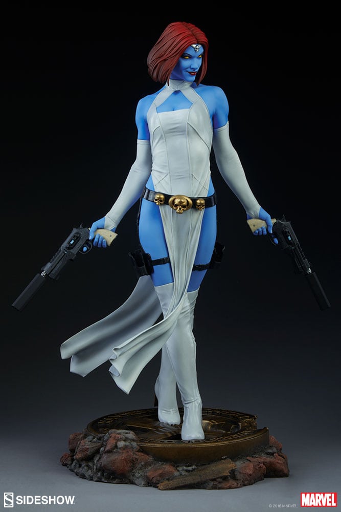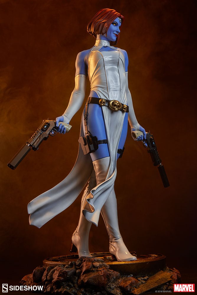 The Mystique Premium Format Figure captures the sultry shapeshifter in her white costume, entirely sculpted with a dynamic fabric-like features and textures. She wields two firearms at her sides, experienced in tactical strategy. The polyresin figure also features sculpted boots, gloves, and a black belt and holsters adorned with golden skull accents and buckles.