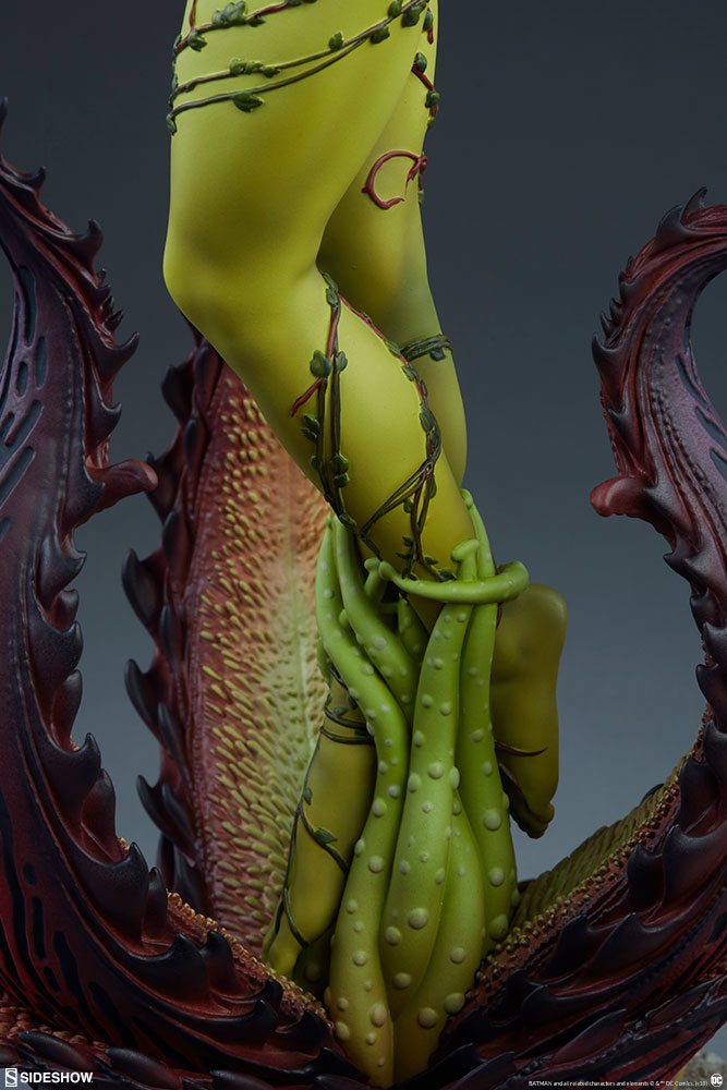 Poison Ivy measures 22” tall, standing in the center of a carnivorous plant with monstrous roots bursting from a cracked-earth environment. The purple petals open to reveal the toxic temptress luring in her next smitten victim.