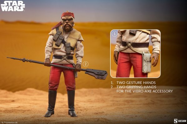 Inspired by the character’s appearance in Return of the Jedi, this fully articulated, highly poseable high-end Star Wars figure wears tailored fabric clothing accurate to his on-screen ensemble. His outfit consists of layered tan shirts, red trousers, a red bandana, and multiple brown belts. The Kithaba Sixth Scale High-End Collectible Figure also comes with two relaxed hands as well as two gripping hands for the vibro-axe accessory.