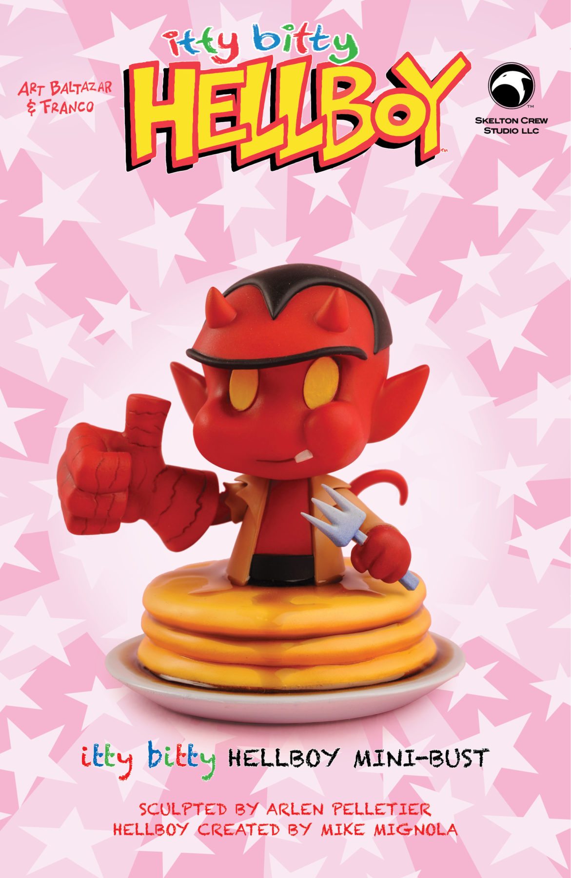 Sculpted by Arlen Pelletier, the officially licensed collectible measures 3.75-inches tall and features itty bitty Hellboy standing, with his trademark smirk, giving a thumbs up, on a big stack of buttery, syrupy pancakes.