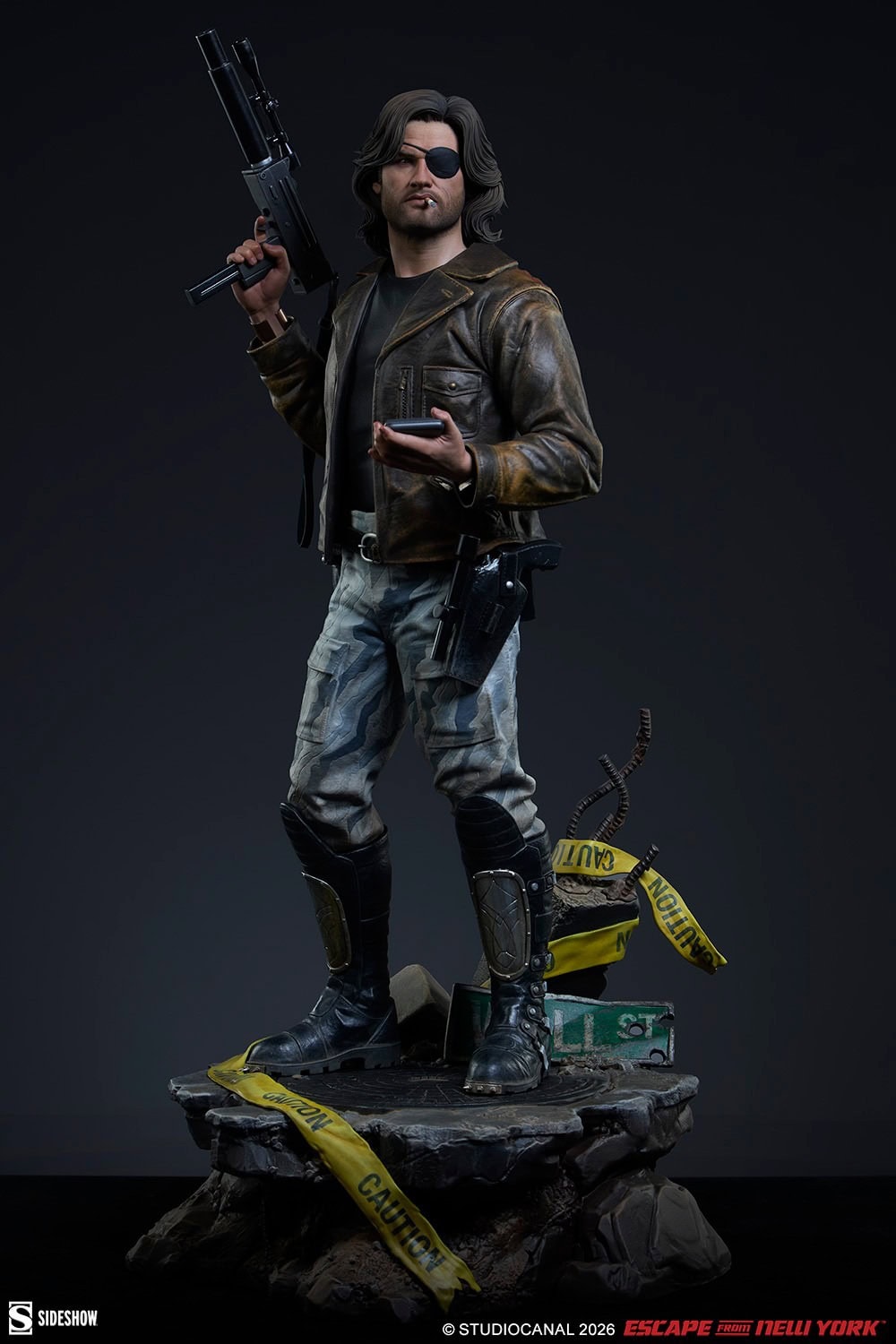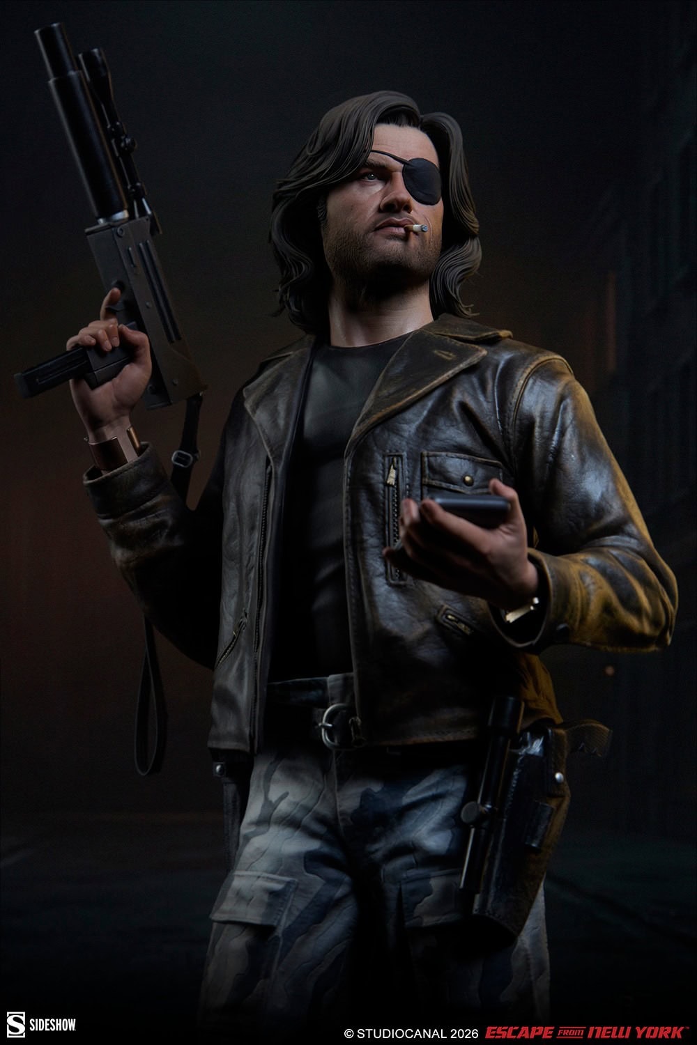 The Snake Plissken Premium Format™ Figure is sculpted wearing a detailed recreation of his rugged ’80s style, including his jacket, black undershirt, gray and white camo pants, and spike-toed boots. Of course, Snake didn’t go in unprepared — the statue also features his belt and gun holsters, a tracker in his left hand, a submachine gun with silencer and scope (soft fabric strap included) in his right hand, and the Life Clock countdown timer on his wrist to ensure he stays on task. A detailed portrait completes his iconic silhouette with an eyepatch, cigarette, facial hair, and styled mullet, all ready for action.